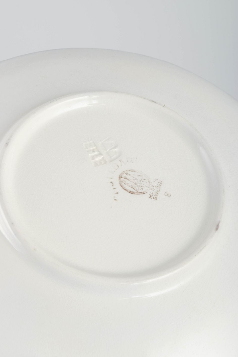 Bio: Gefle Porcelainsfabrik blev grundlagt i 1910 i Gävle og udviklede sig hurtigt til en af Sveriges mest betydningsfulde producenter af porcelæn og fajance. I 1930’erne fortsatte man traditionen med transfertrykte og reliefdekorerede stel til både husholdning og eksport. Dekorationen “Mullbär” er et fint eksempel på tidens naturalistiske ornamentik, med vinranker som klassisk motiv inspireret af historiske stilarter.