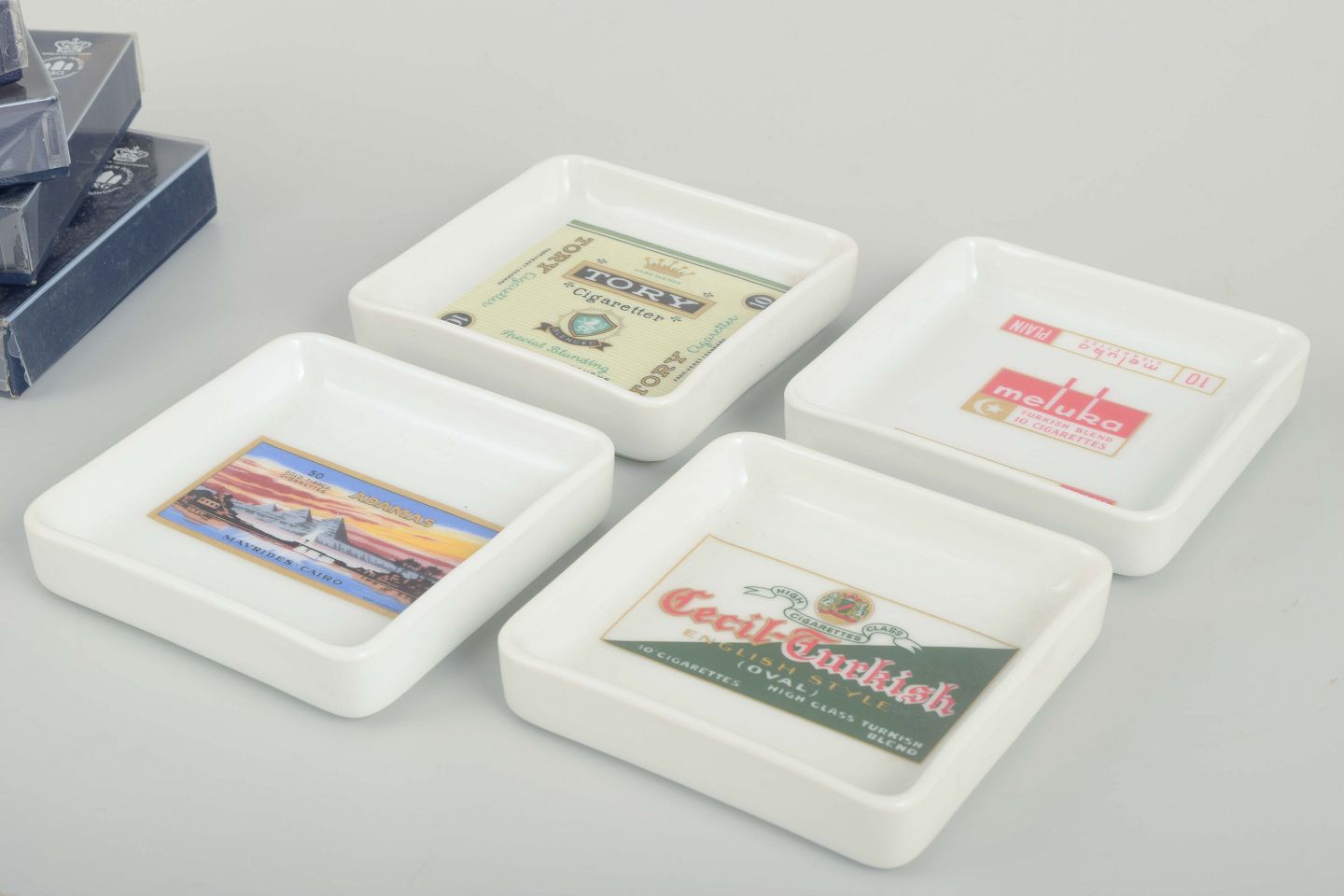 Set of four square porcelain ashtrays, each decorated with classic tobacco and cigar motifs. Supplied in original boxes.