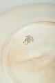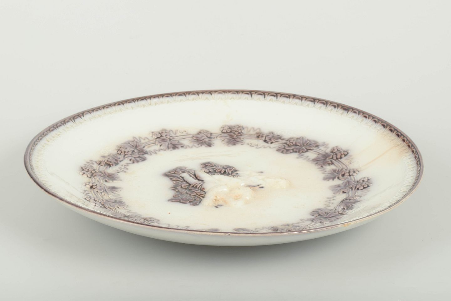 Rundt fajancefad med reliefdekor og transfertrykt vinrankemotiv i brunlig tone, centralt dekoreret med putti-figurer (små engle).