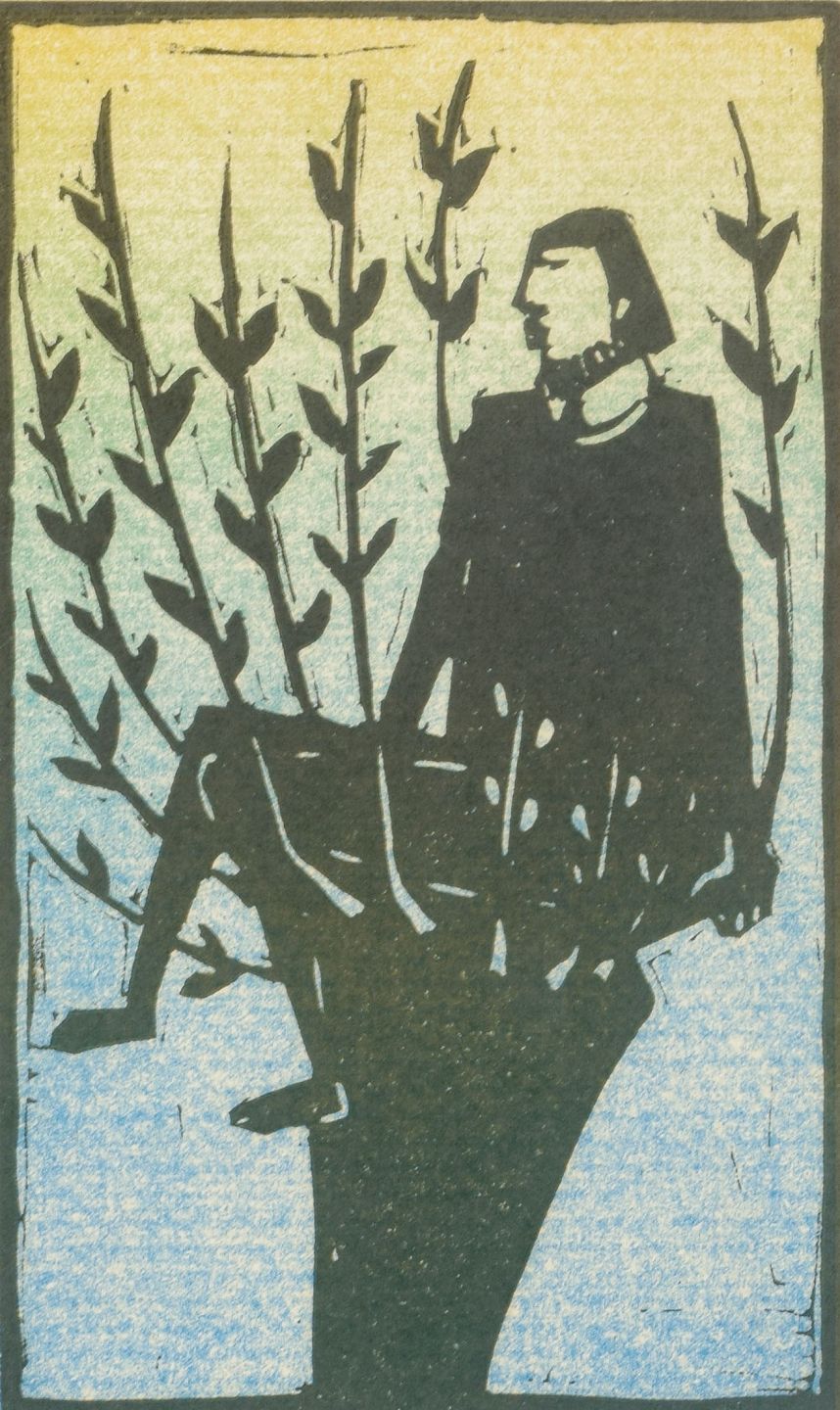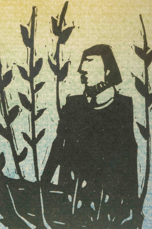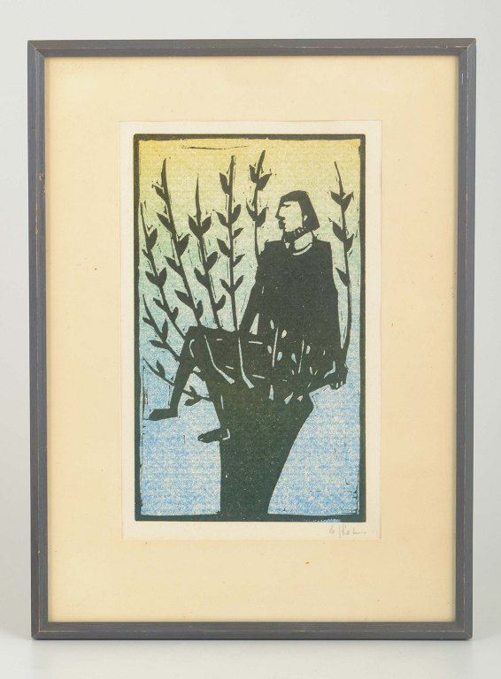 Et karakteristisk træsnit af den svenske keramiker og billedkunstner Åke Holm, kendt for sine stiliserede, religiøst prægede motiver og sikre formsprog. Her fremstilles en bibelsk figur i en enkel, grafisk komposition.
