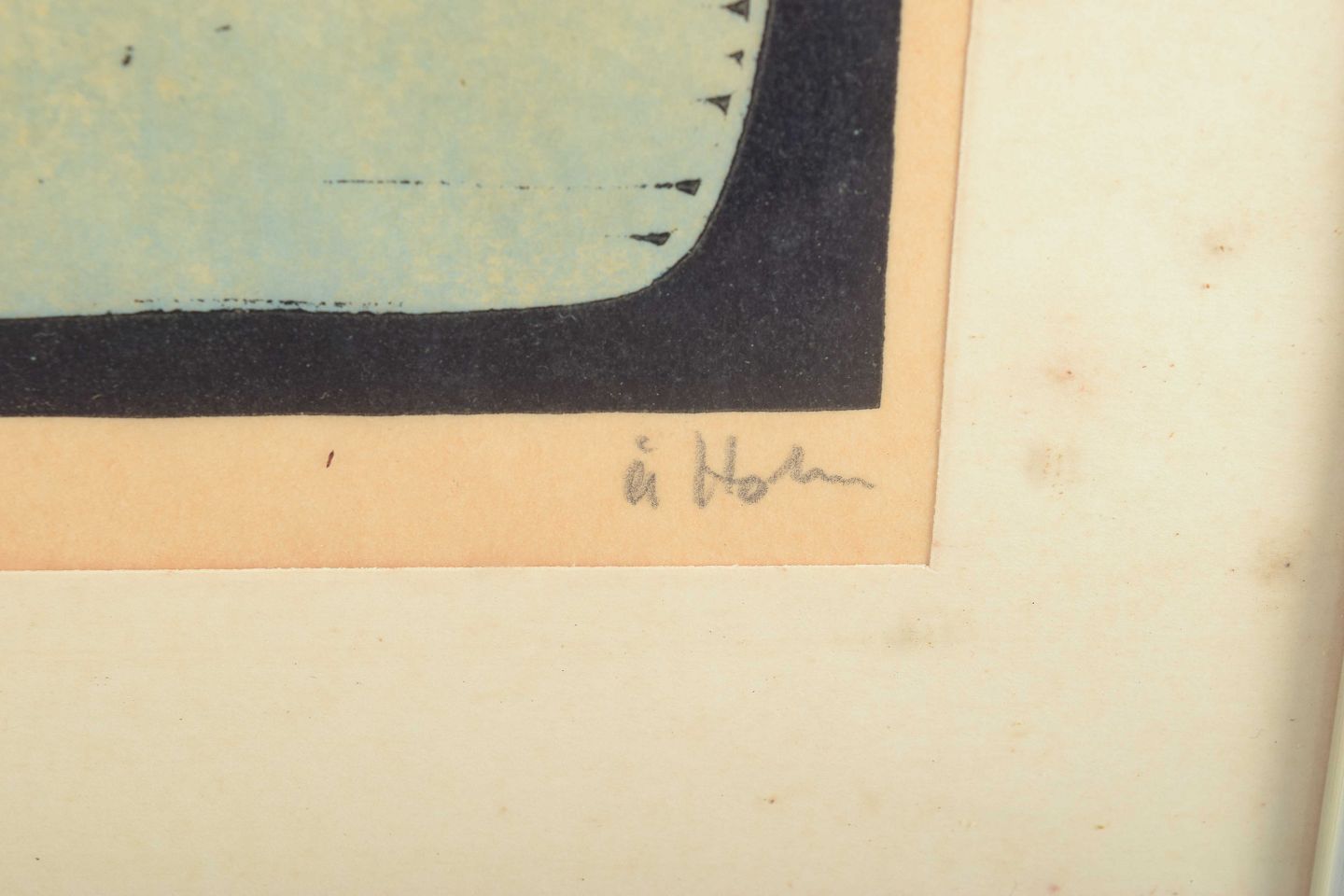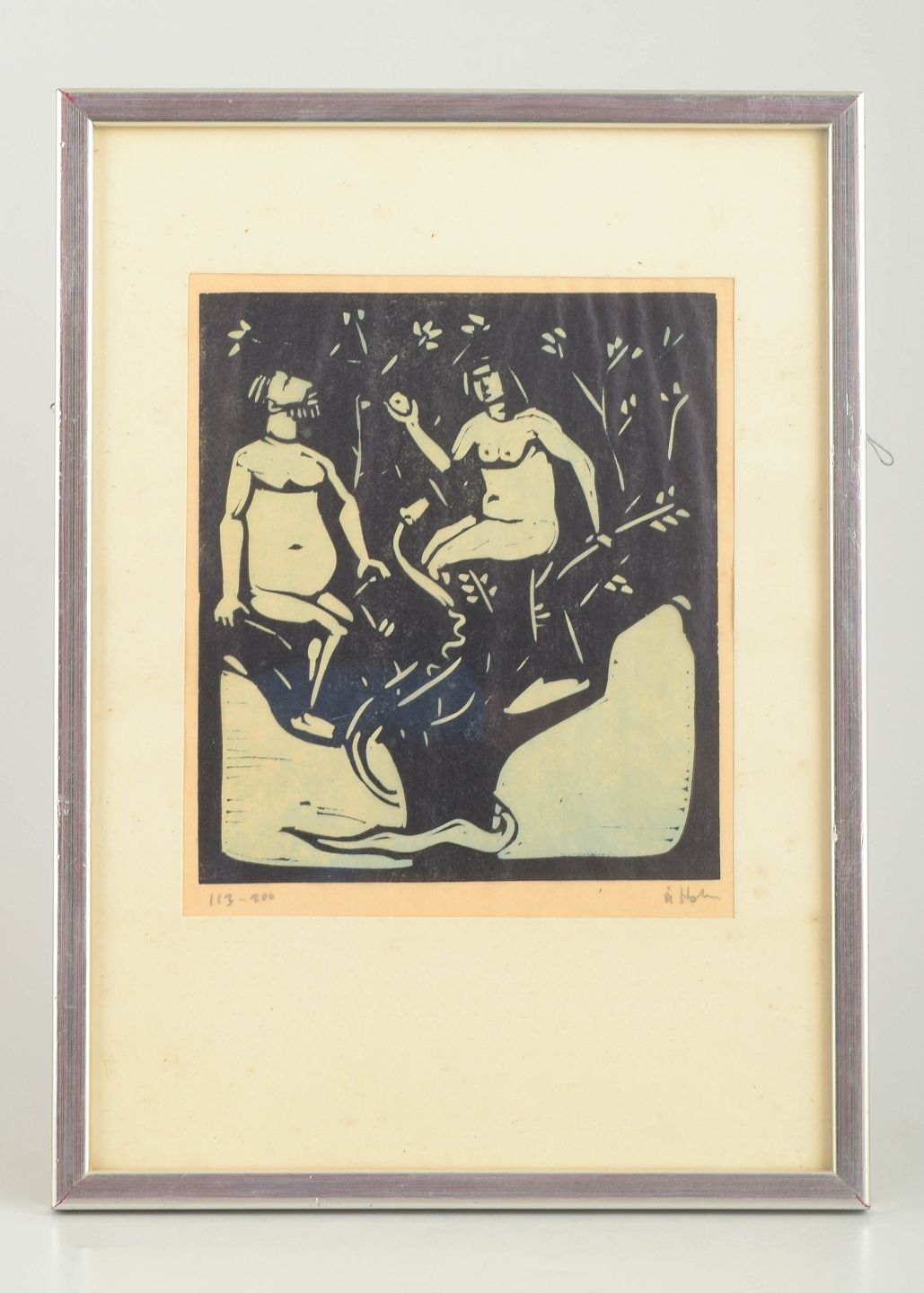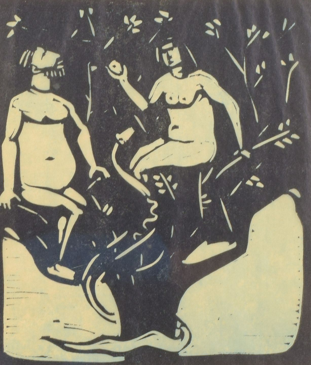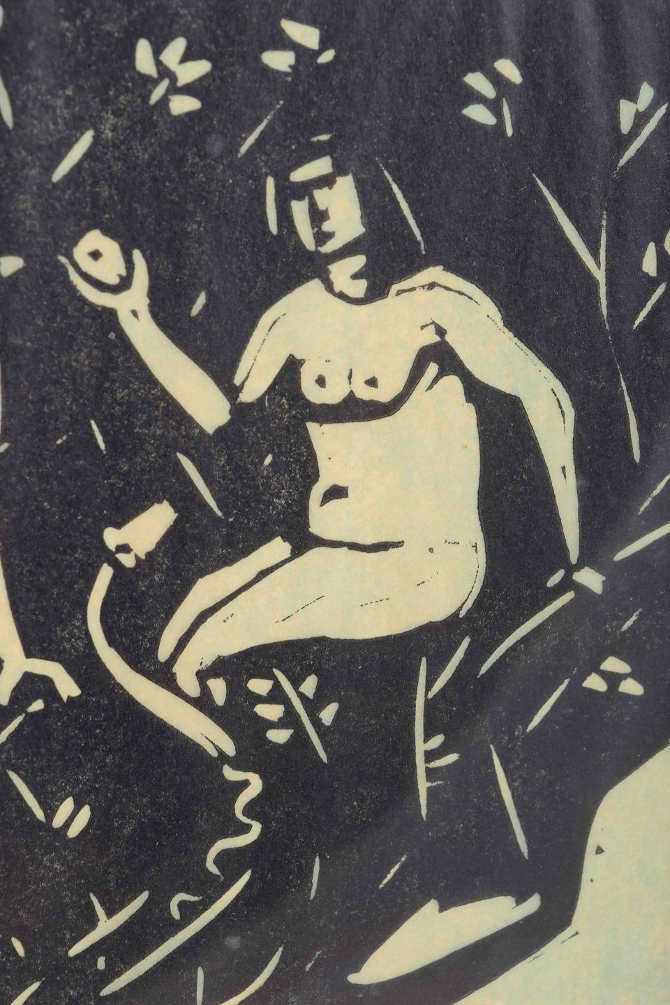 Et ekspressivt træsnit af den svenske keramiker og billedkunstner Åke Holm, der ofte arbejdede med religiøse og mytologiske motiver i sine grafiske arbejder. Motivet viser Adam og Eva i Paradisets Have med kundskabens træ og slangen, gengivet i Holm’s karakteristiske, monumentale formsprog.