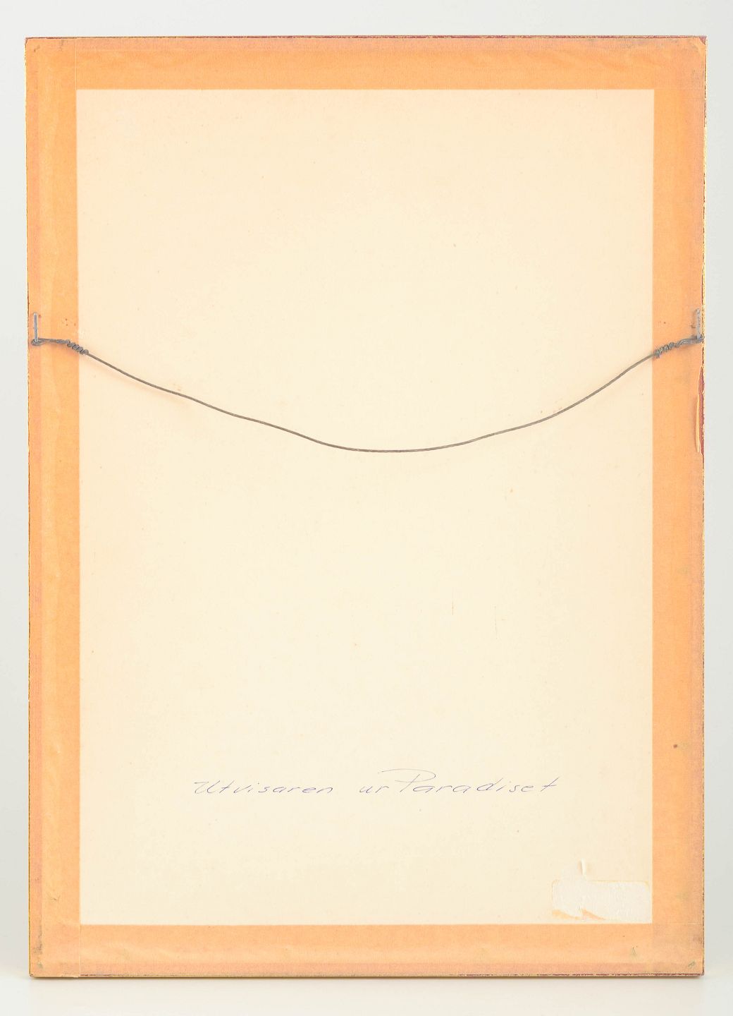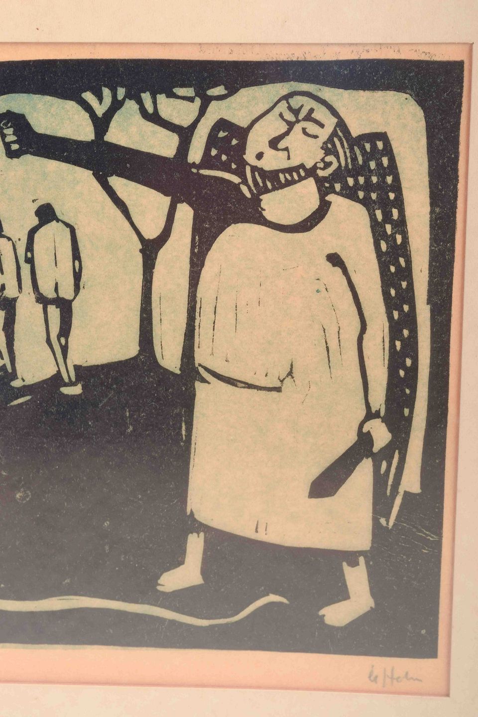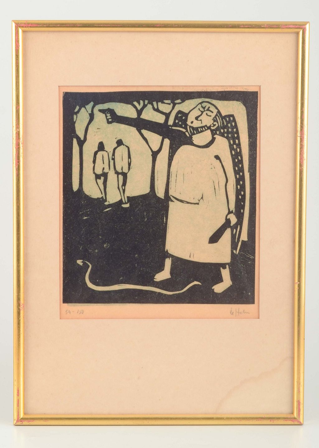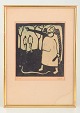 Et ekspressivt træsnit af den svenske keramiker og billedkunstner Åke Holm, kendt for sine stærke religiøse og mytologiske motiver, udført i grafiske sort-hvide kontraster.