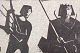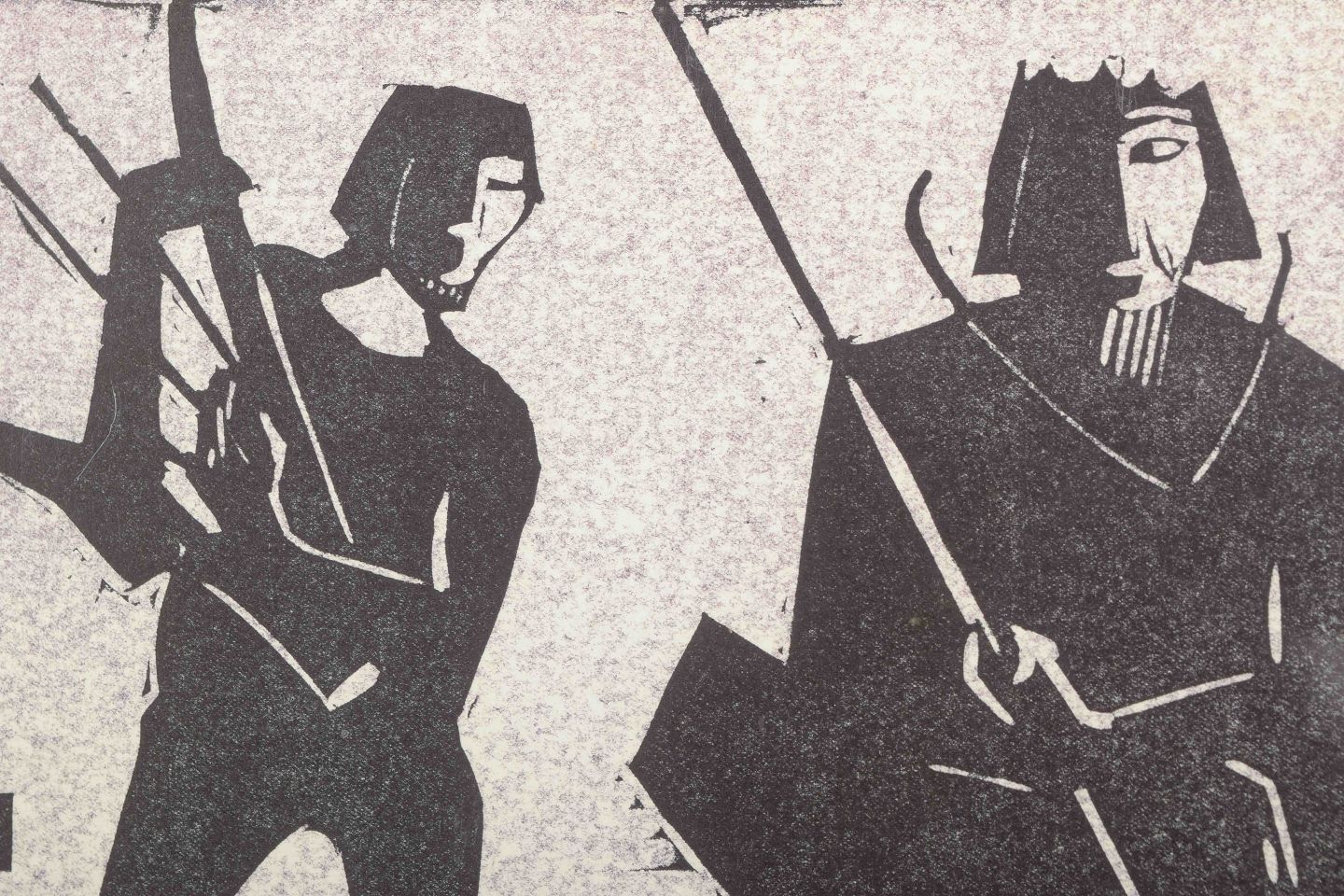 Et karakteristisk grafisk arbejde af Åke Holm, hvor de stiliserede figurer og kontrastfyldte flader tydeligt afspejler kunstnerens ekspressive billedsprog. Motivet fortolkes som David med harpen overfor kong Saul på tronen – en klassisk bibelsk scene, der her er reduceret til monumentale, kantede former i dramatisk kontrast.