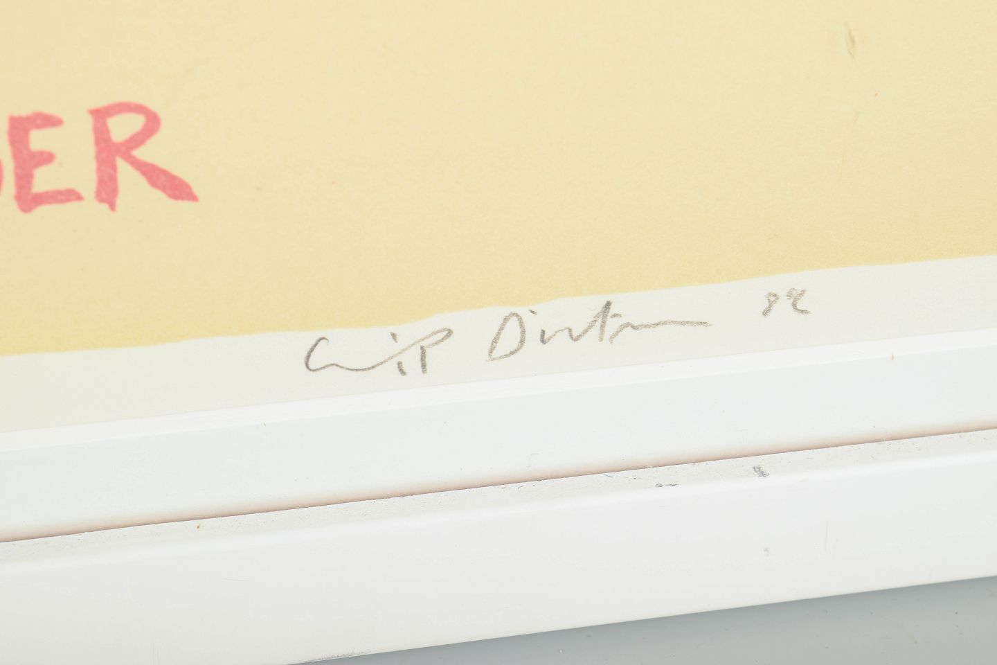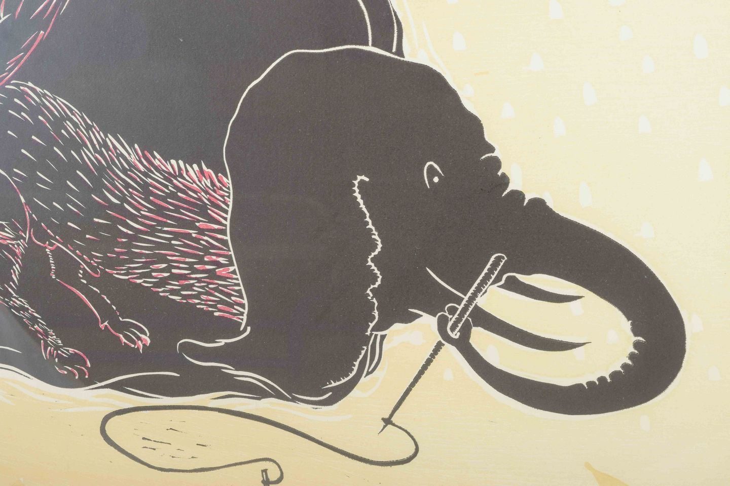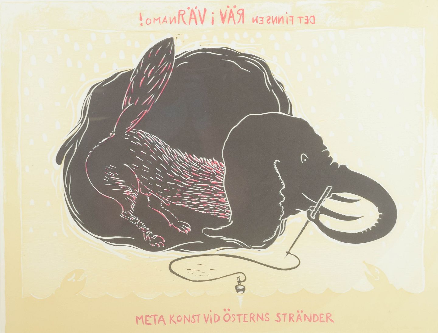 Et karakteristisk litografi af Erik Dietman fra 1982 med et surrealistisk motiv, hvor dyr og former blandes i en humoristisk og legende billedverden.
