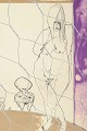 Et ekspressivt litografi af Roy Lindqvist, udført i et stiliseret formsprog med grafiske konturer, stærke kontraster og farvefelter i violet og okker. Værket viser en figurkomposition med både humor og social kommentar.