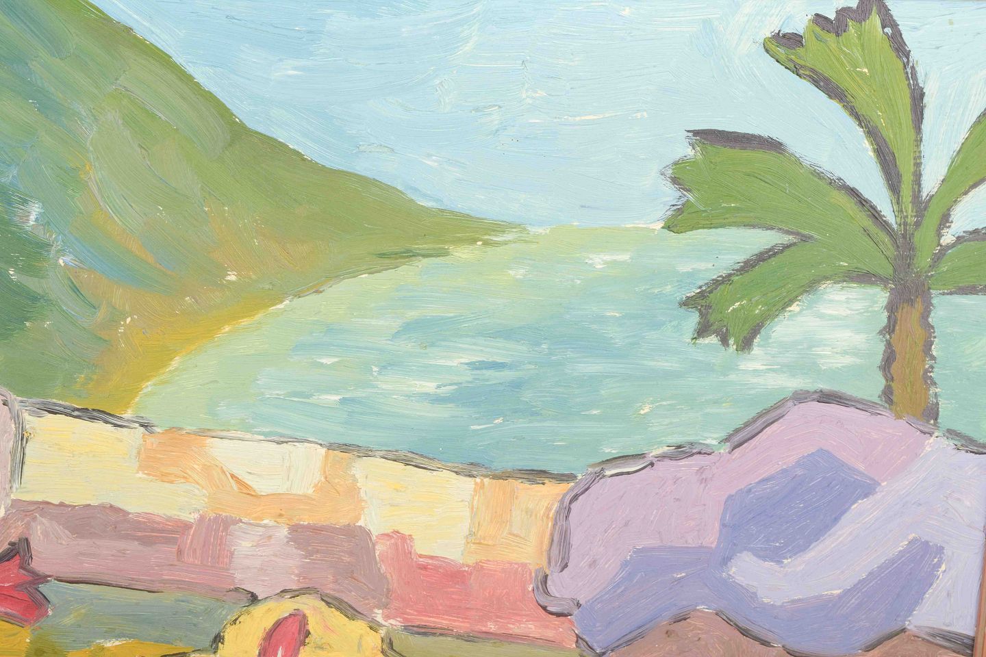 Et farverigt og dekorativt maleri af den norske kunstner Kaare Sunde, udført i 1955. Motivet viser et eksotisk landskab med frodig vegetation, blomster og udsigt til havet. Værket er kendetegnet ved en stærk koloristisk palet og forenklede former, der giver maleriet et moderne og dekorativt udtryk.