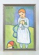 Et stemningsfuldt figurativt maleri, der viser et barn med en due i hænderne og en farverig bold i forgrunden. Kompositionen er enkel og præget af klare konturer, rolige farvefelter og en sart stemning, som fremhæver motivets stille alvor.