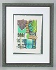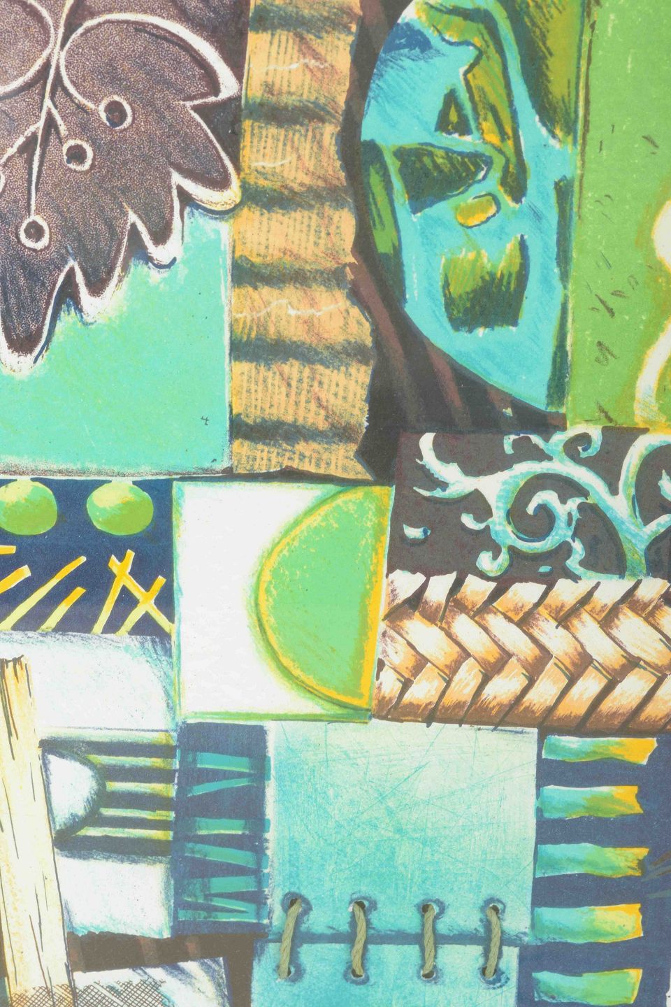 Et farverigt og dynamisk litografi, hvor geometriske og organiske former sammensættes i et patchwork-lignende mønster. De blå, grønne og jordfarvede toner skaber en rytmisk og teksturel helhed, hvor elementer som blade, vævede strukturer og dekorative linjer flettes ind i hinanden. Værket bærer præg af Soucasses interesse for balance mellem naturinspirerede symboler og en mere konstruktiv, abstrakt billedopbygning.