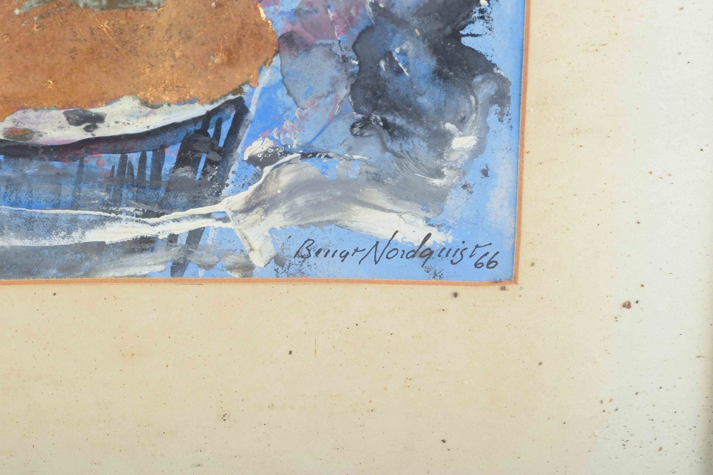 Bengt Nordquist (1927–2010) var en svensk kunstner, kendt for sine abstrakte og koloristiske værker, ofte udført i gouache, akvarel og blandede teknikker. Han skabte stemningsfulde kompositioner med både lyriske og symbolske undertoner. Nordquist var aktiv i 1950’erne–70’erne, hvor han deltog i flere udstillinger i Sverige, og hans værker findes i både private og offentlige samlinger.