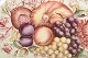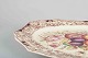 Rektangulært fad med afrundede hjørner i fajance. Dekoreret med blomster- og frugtmotiv i midten, samt brun ornamenteret bort langs kanten.