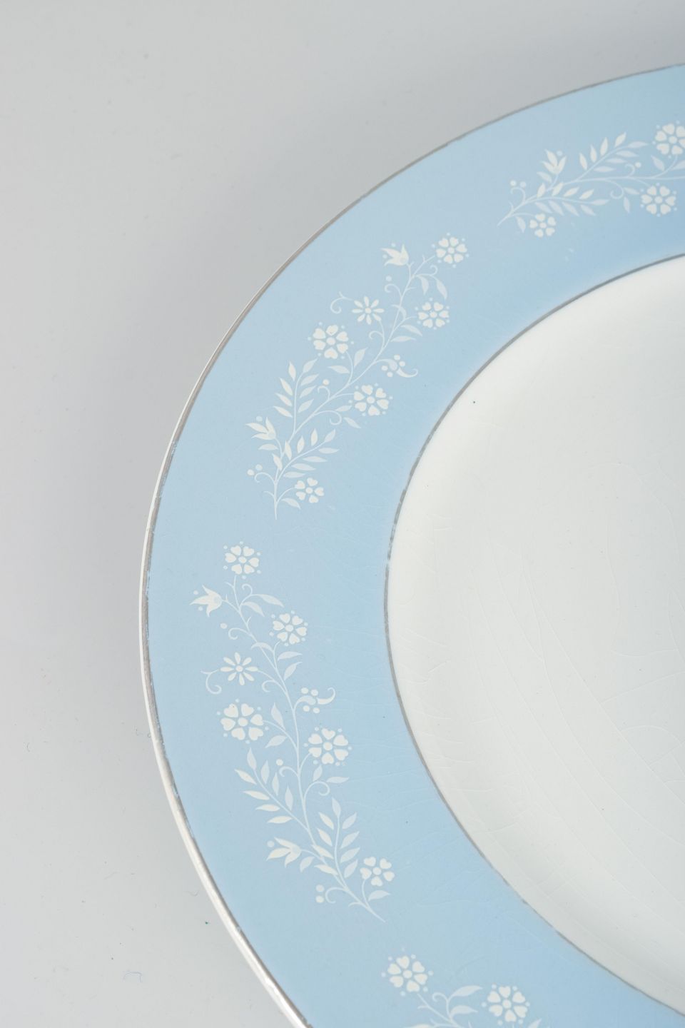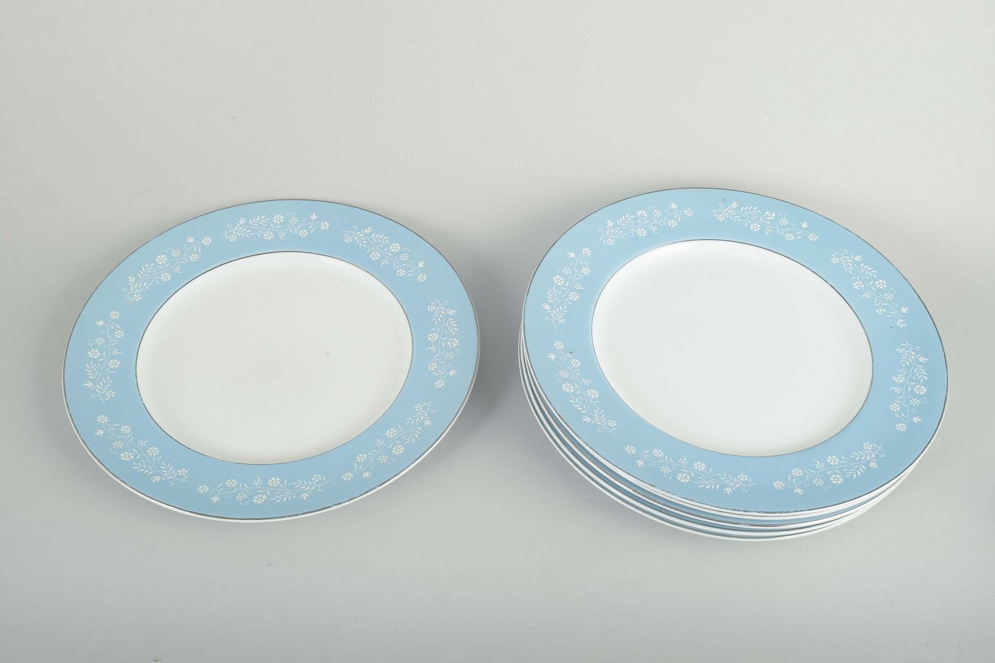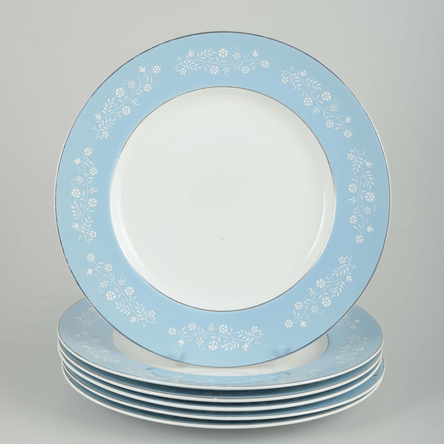 Sæt á seks middagstallerkener i fajance med blå kant dekoreret med hvide blomster og sølvfarvet rand.