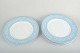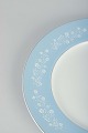 Sæt á seks middagstallerkener i fajance med blå kant dekoreret med hvide blomster og sølvfarvet rand.