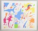 Et fantasifuldt og farverigt værk med figurer, der minder om dyr og fugle, udført i stærke kontrastfarver. Kompositionen har et legende og spontant udtryk med inspiration fra naturens former.
