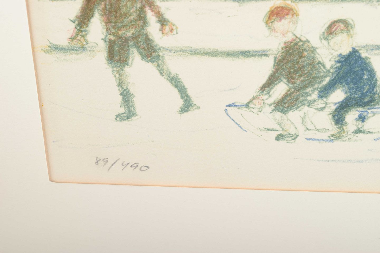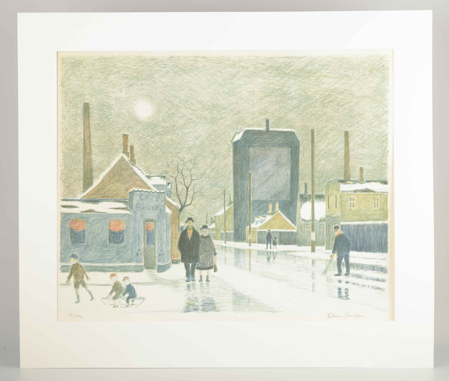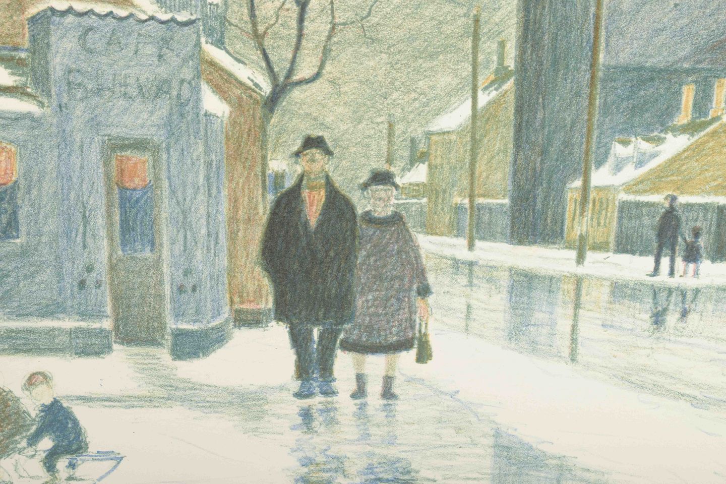 En stemningsfuld skildring af arbejderkvarteret i vintertid, hvor børn leger på isen og forbipasserende bevæger sig langs de sneklædte gader under en kold, bleg sol. Bendtsens karakteristiske blik for arbejderklassens hverdag fremtræder i motivets enkle, men poetiske gengivelse af livet i byens udkant.