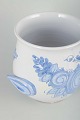 Organisk formet urtepotte-skjuler i hvidglaseret fajance med håndmalet blå spiral- og blomstermotiv.