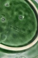 Organisk formede fajancetallerkener i majolika, udført som kålblade i grøn glasur.