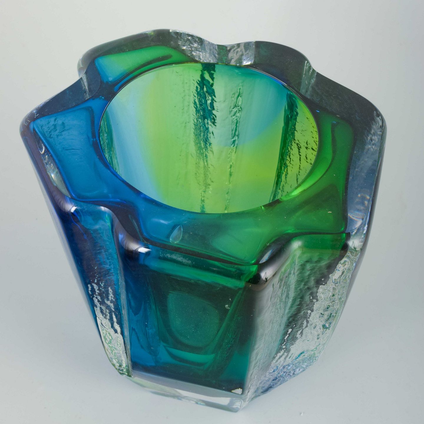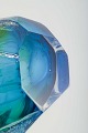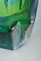 Organisk formet glasvase i blå og grønne nuancer med kraftig, skulpturel krop og facetteret formgivning.