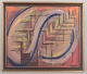 Et farverigt og geometrisk-abstrakt maleri, hvor organiske og lineære former krydser hinanden i et spil af blå, gule og rødlige nuancer. Den centrale bølgende form deler billedfladen og skaber en rytmisk kontrast til baggrundens netværk af kantede strukturer.