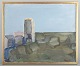 Et modernistisk landskabsmaleri med geometrisk-abstrakte former og en monumental bygning centralt i kompositionen. De brede penselstrøg og afdæmpede farver understøtter værkets stoflige og arkitektoniske udtryk.