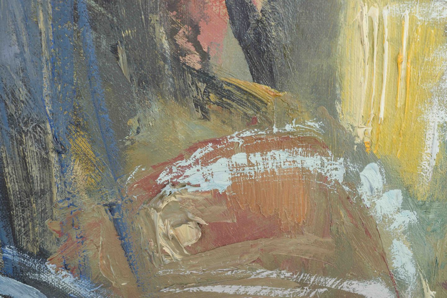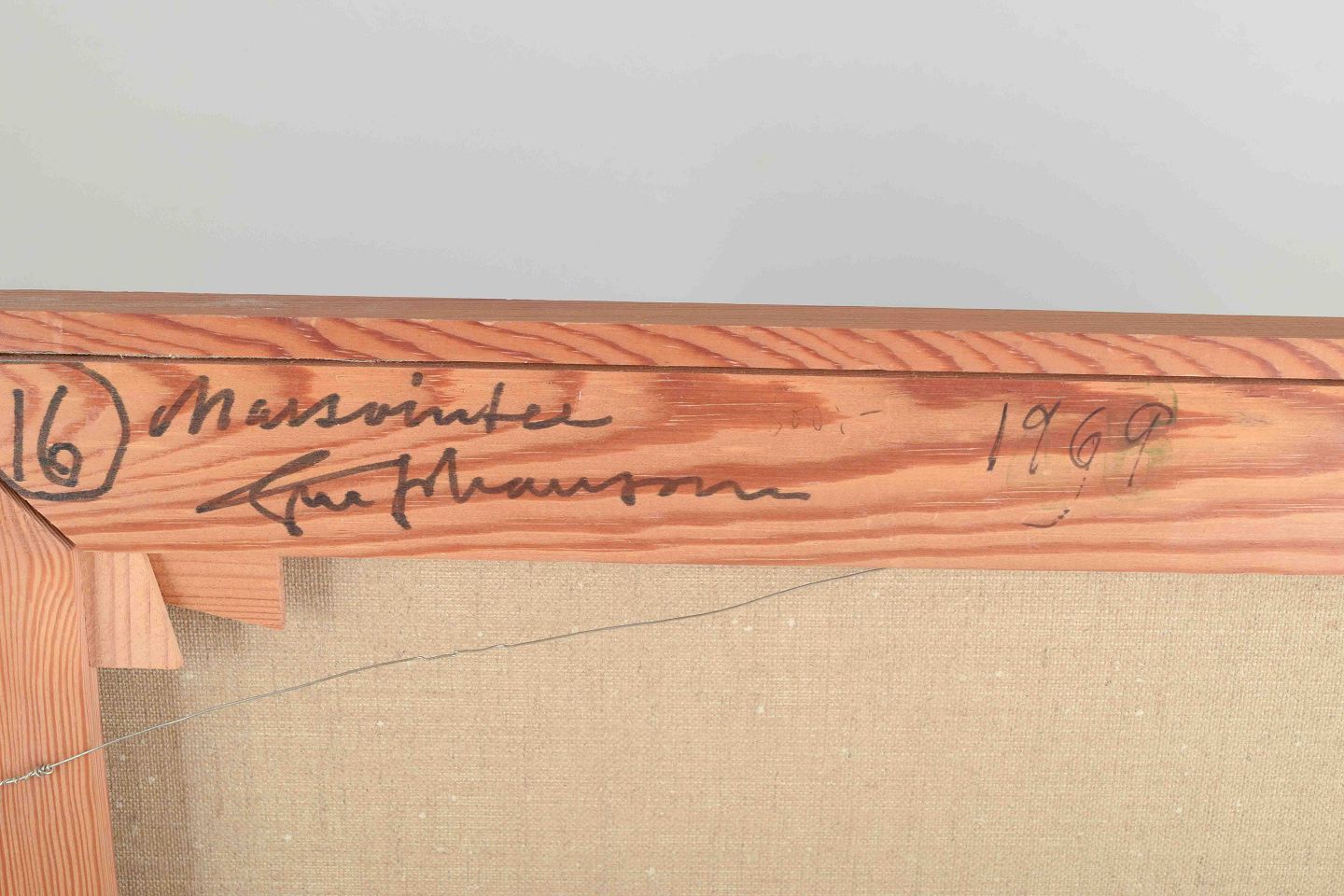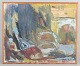 Et modernistisk landskabsmaleri med vinterscene, der skildrer sneklædte marker og en kold himmel i en struktureret og farverig komposition. Værket afspejler Johanssons følsomhed for farve og form i en nordisk kontekst.