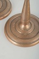 Massive messingstager med rund fod og geometriske ringdekorationer, typiske for perioden.