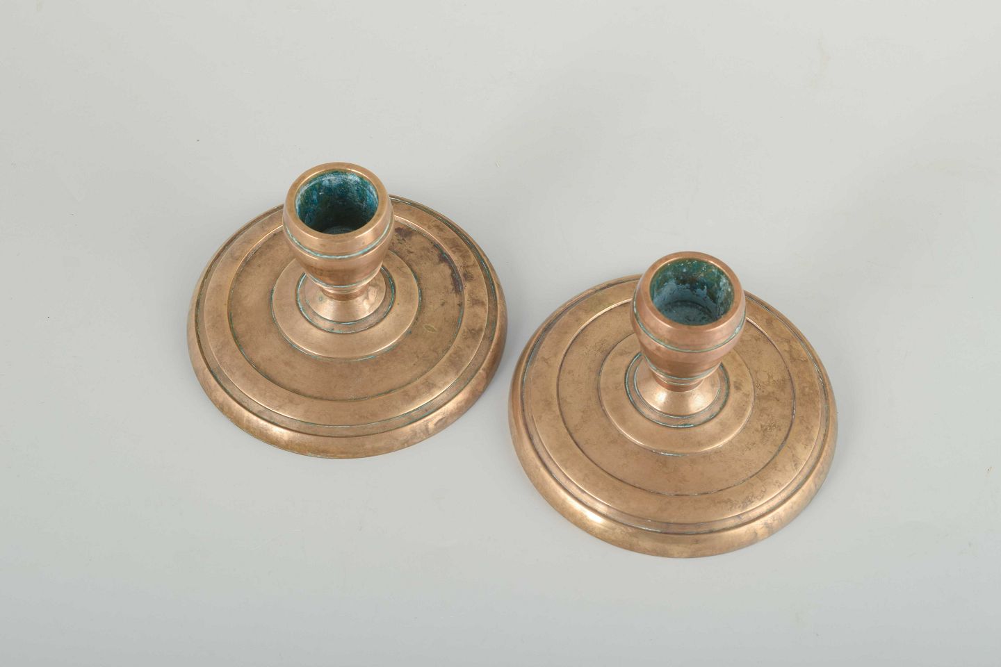 Massive messingstager med rund fod og geometriske ringdekorationer, typiske for perioden.