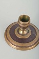 Massive messingstager med rund fod og geometriske ringdekorationer, typiske for perioden.