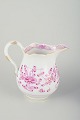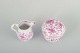 Porcelænssæt bestående af sukkerskål med låg og flødekande, håndmalet i det klassiske mønster "Pink Indian", dekoreret med rosa blomster og blade samt guldbemaling på kanter, knop og hanke.