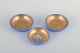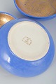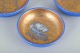 Set of three low faience bowls with blue exterior glaze and metallic gold interior glaze with craquelure.