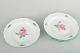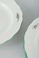 Fire tallerkener i porcelæn dekoreret med håndmalede rosa roser og grøn kant. Stemplet med Meissens krydsede sværd under bunden.