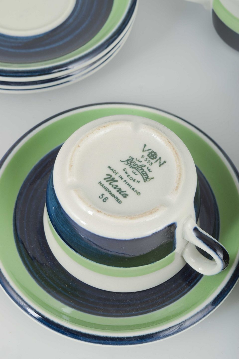 Samling bestående af kagetallerkener, kopper, underkopper og sukkerskål i fajance med hvid glasur, grøn og blå dekoration.