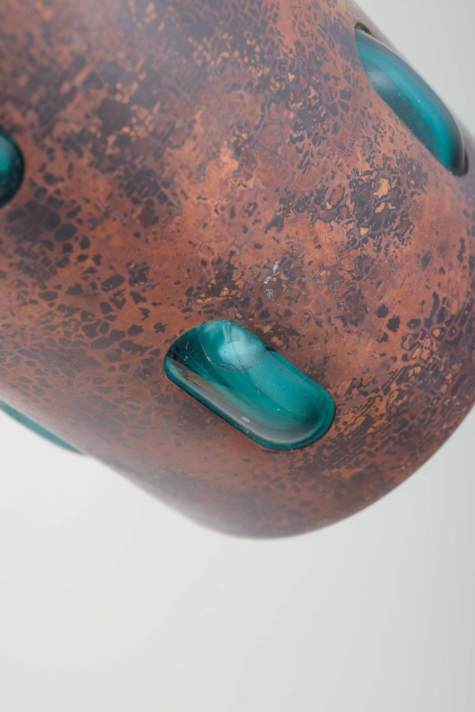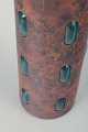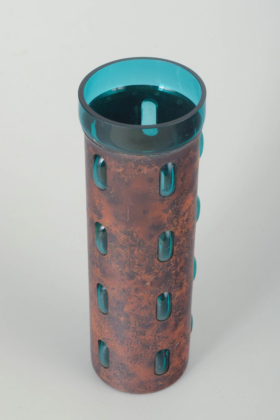En dekorativ vase udført i hamret kobber med indsat glas i blågrøn tone, designet af Nanny Still for Raak. Kombinationen af metal og glas er karakteristisk for Still, som ofte arbejdede med kontraster og skabte værker, der balancerede mellem funktion og skulpturel form.