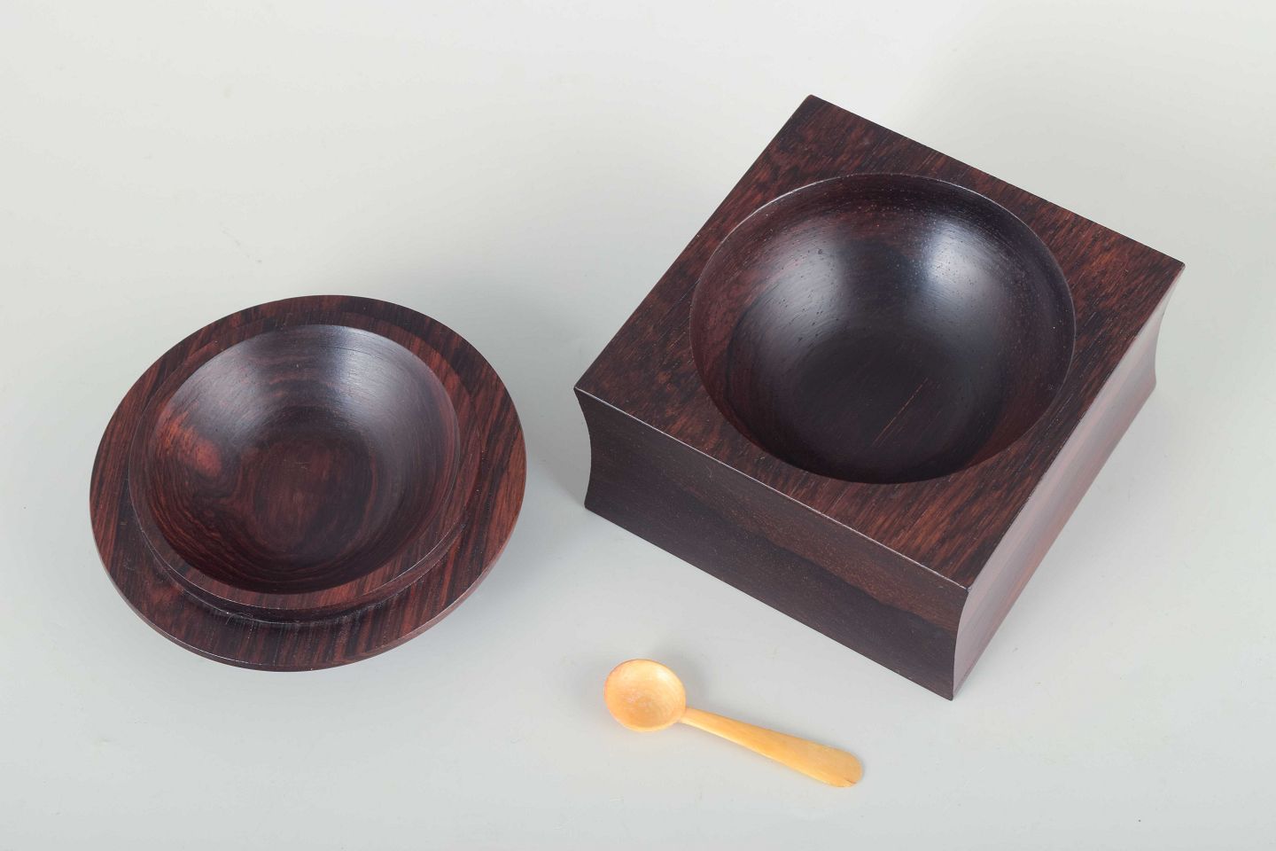 Elegant firkantet æske i eksotisk træ med buet låg og original ske i horn. Enkel og funktionel formgivning, karakteristisk for dansk design i 1960’erne.
