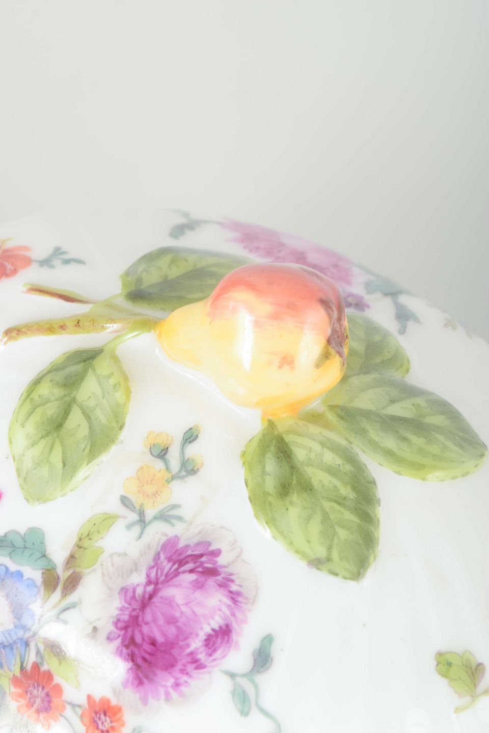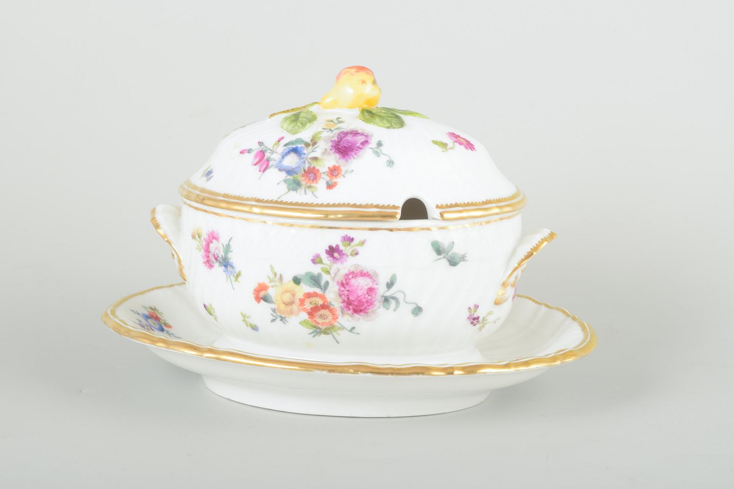 Sjælden antik sovseskål i porcelæn dekoreret med det klassiske “Sachsisk Blomst” mønster, håndmalede blomster i klare farver og guldkant. Låget prydet med knop formet som en gul frugt.