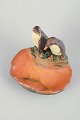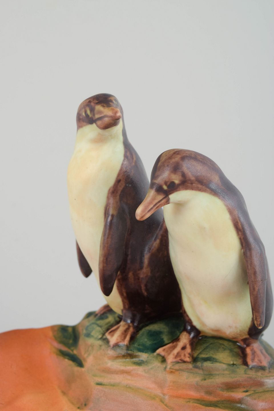 Figurativ skål i glaseret keramik med to pingviner stående ved bassin-formet skål i naturlige grønne og orange nuancer — typisk for Ipsens Enkes naturalistiske dyrefigurer fra mellemkrigstiden.