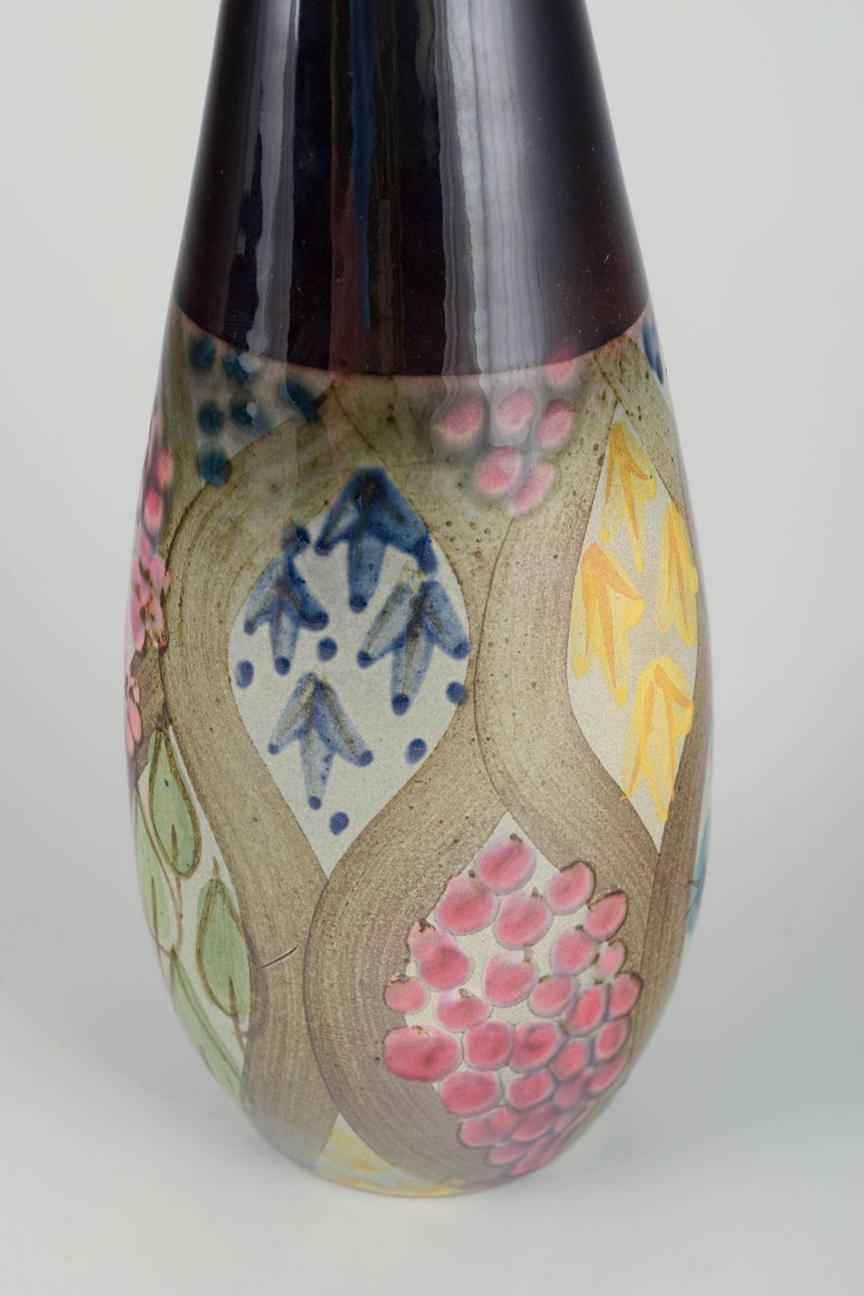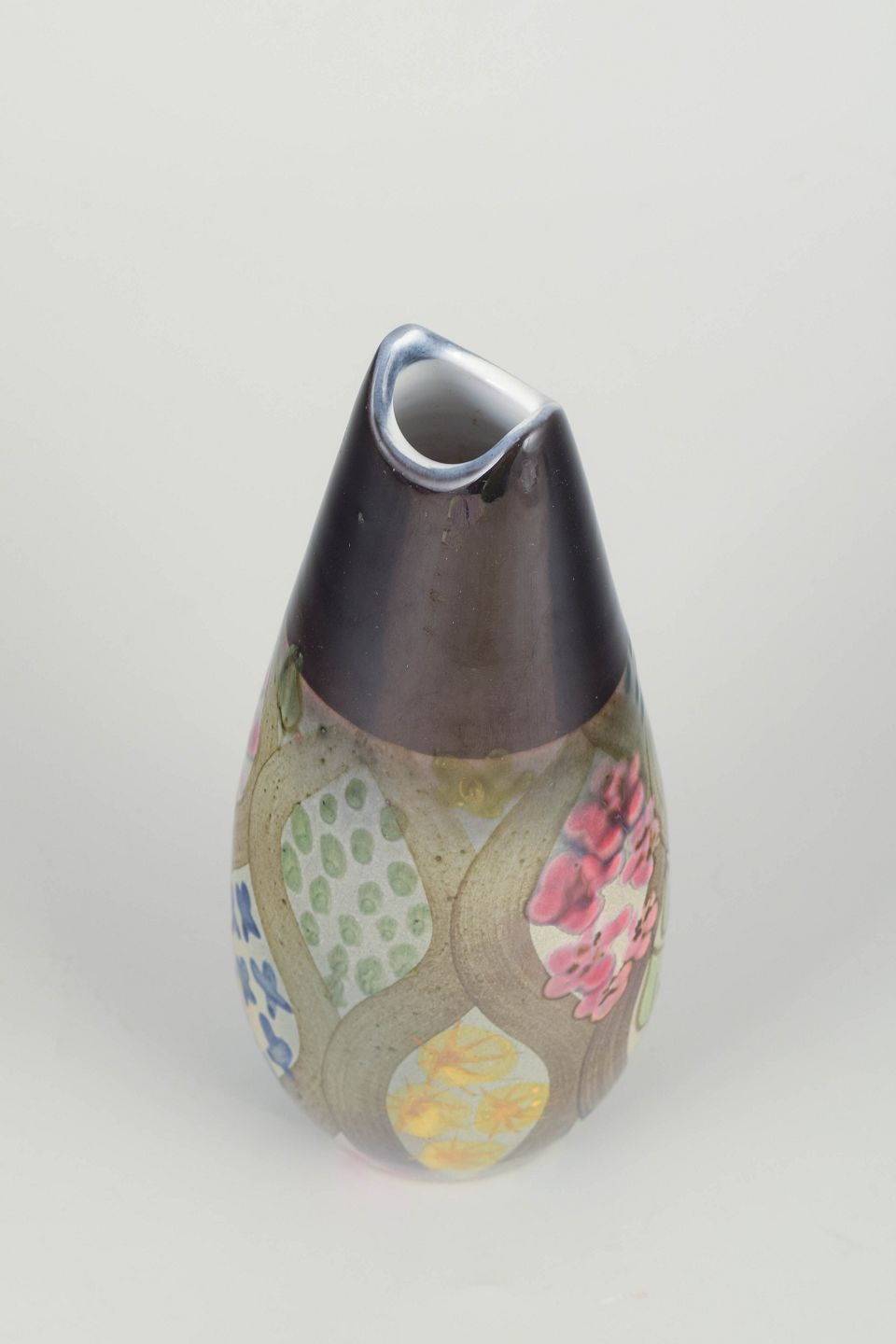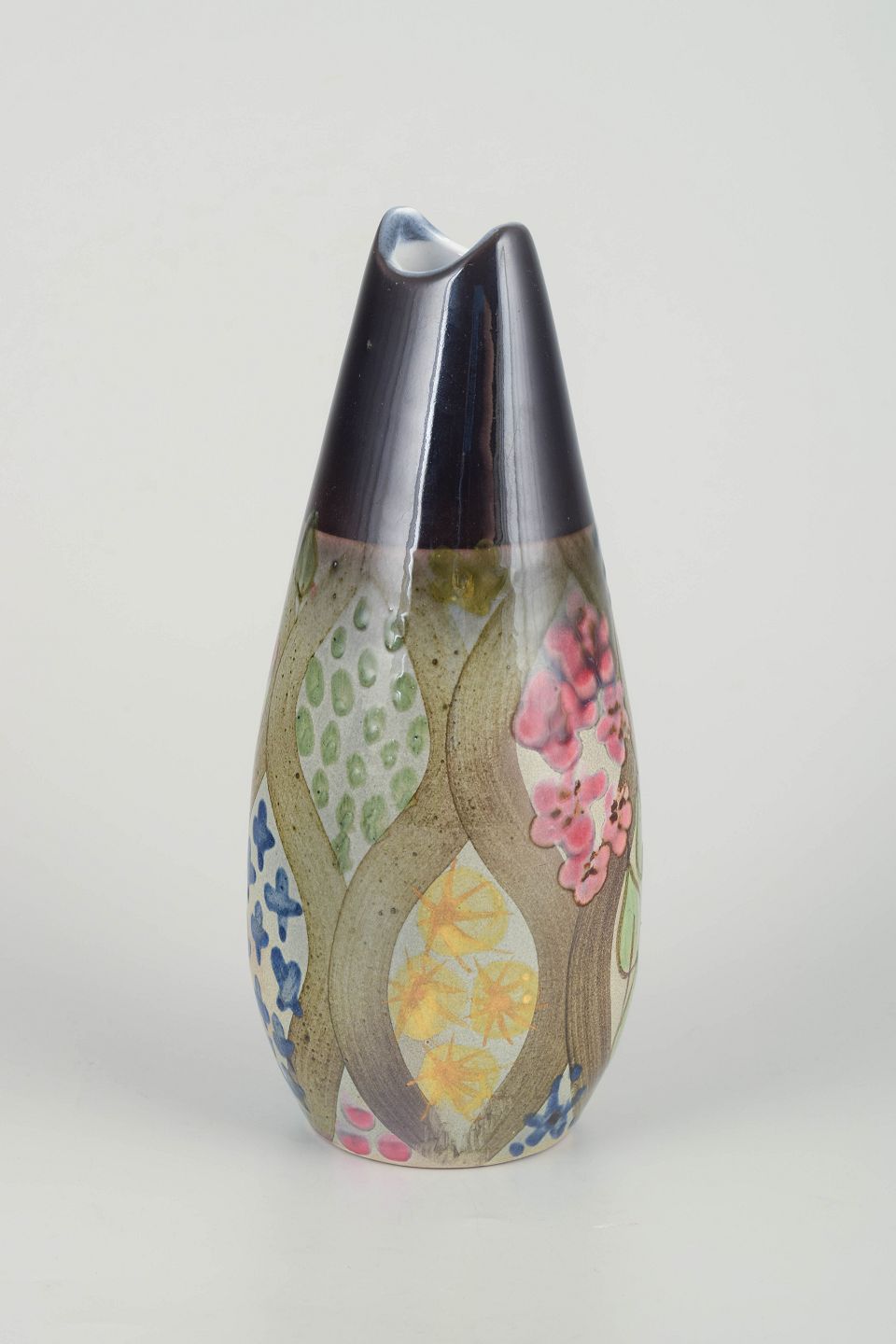 Hand-decorated stoneware vase with characteristic organic form and colourful floral decoration in shades of blue, pink, yellow and green — from the “Mimosa” series, designed by Ingrid Atterberg for Upsala Ekeby in the 1960s.
