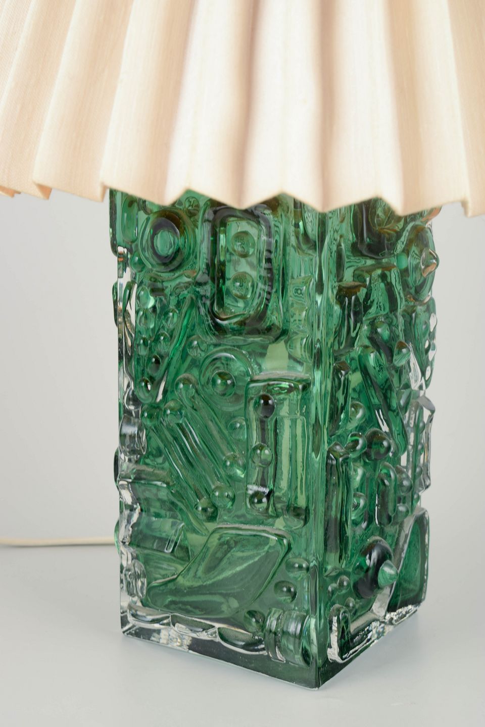 Rectangular lamp base in heavy pressed green art glass with abstract relief patterns and optical texture. Fitted with a pleated fabric lampshade.