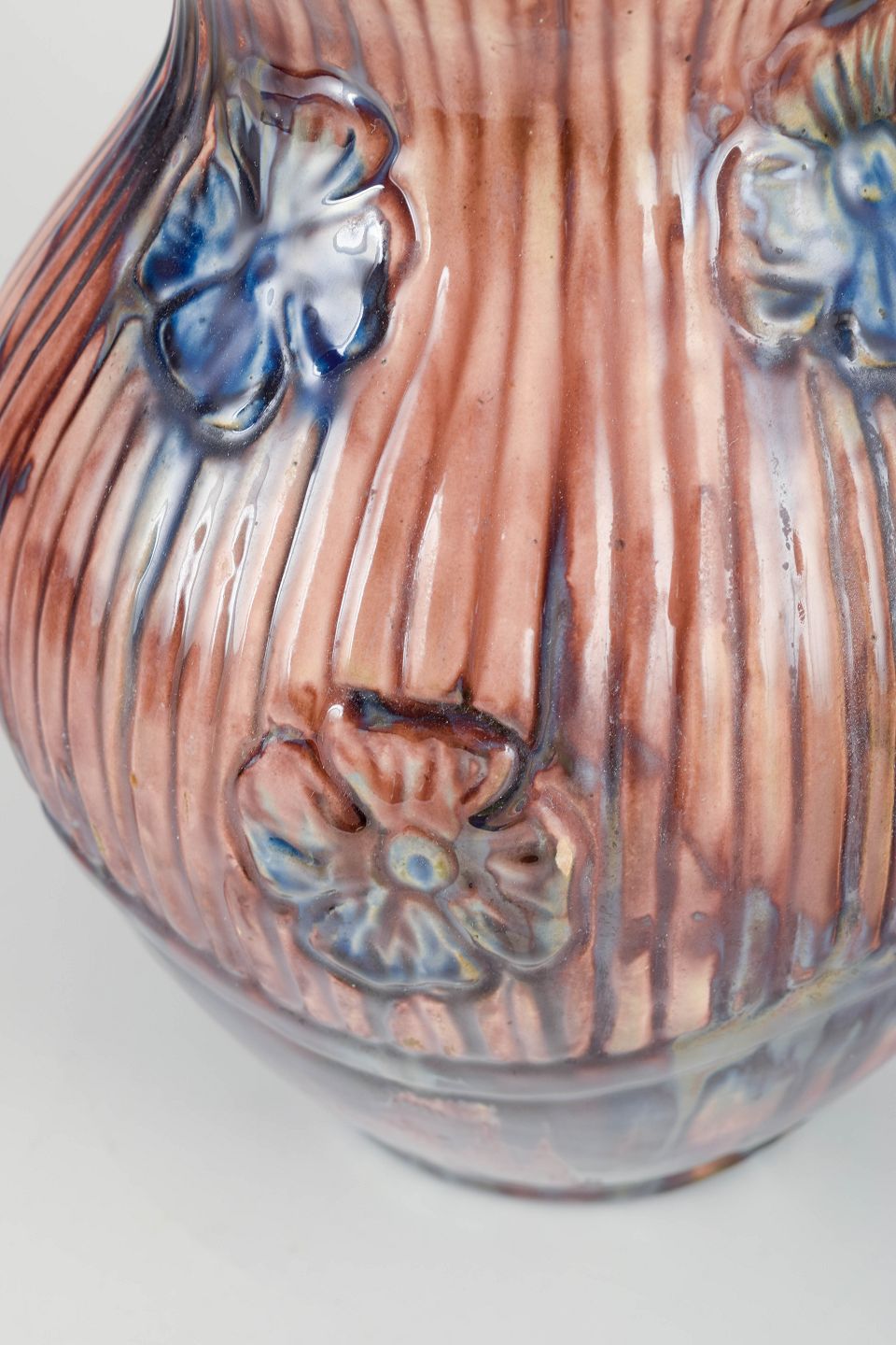 Hand-thrown and richly modelled stoneware vase with vertical ribbing and hand-sculpted floral reliefs. Flambé-style glaze in warm brown tones with flowing blue/violet accents — characteristic of Danish Jugend and early interwar studio craftsmanship.