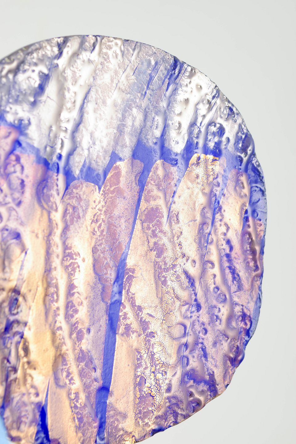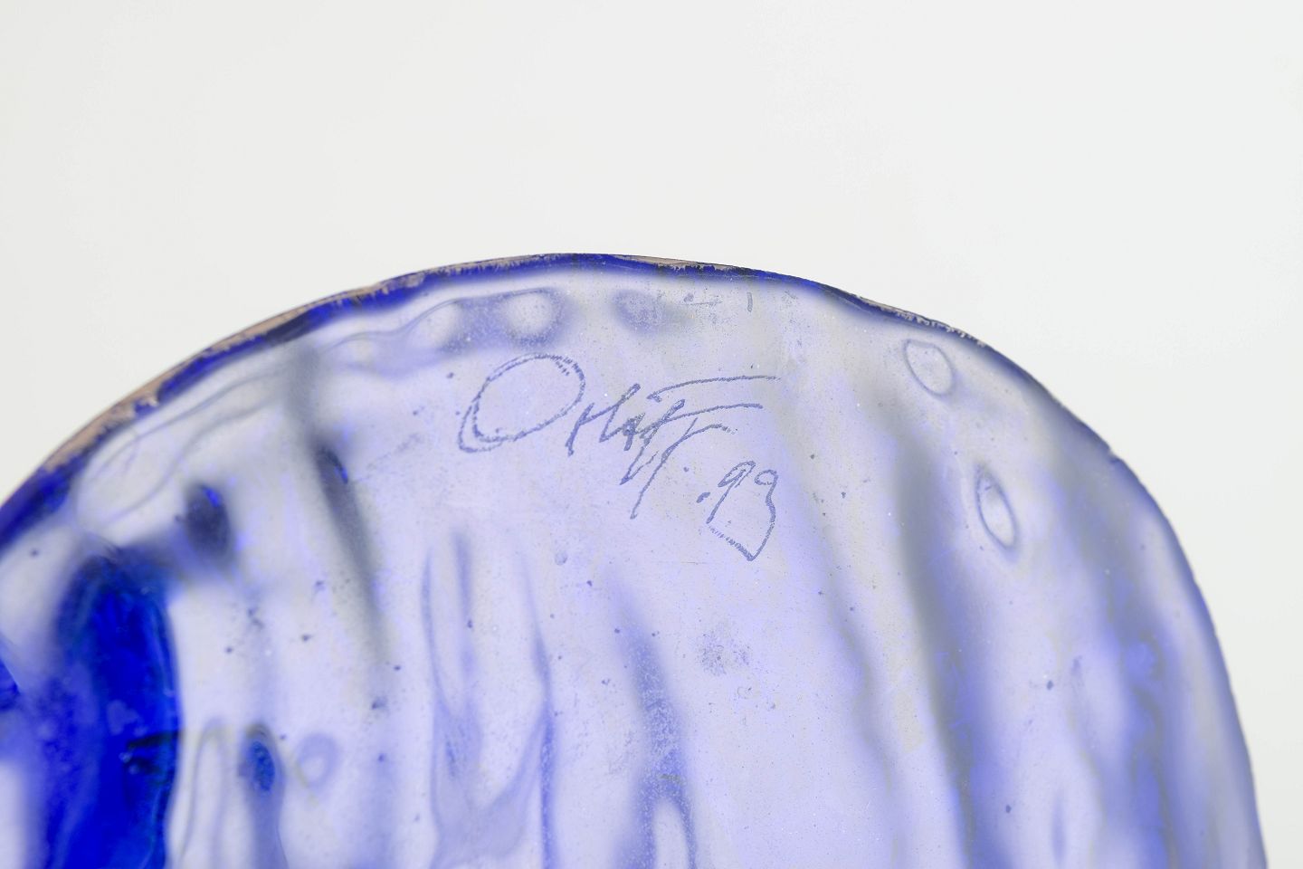 Håndformet fritstående kunstobjekt i intenst dybblåt glas med iriserende overfladespil og organisk tekstur. Unika.