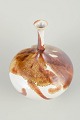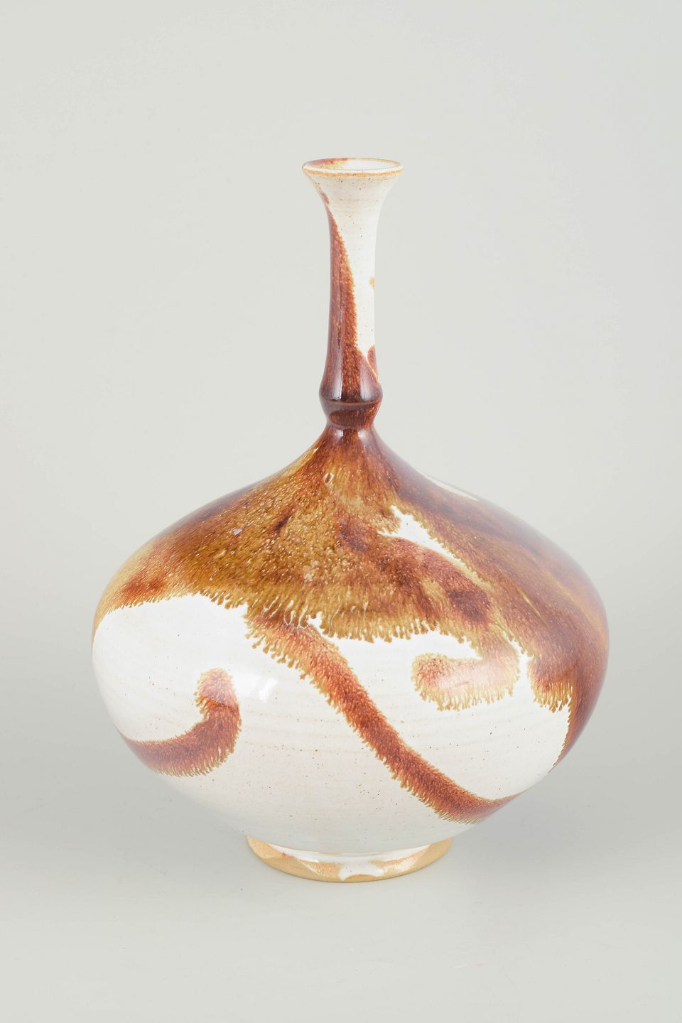 Wheel-thrown stoneware vase with tall slender neck and organic brown flowing glaze over raw white body. One-of-a-kind form, signed by the artist.