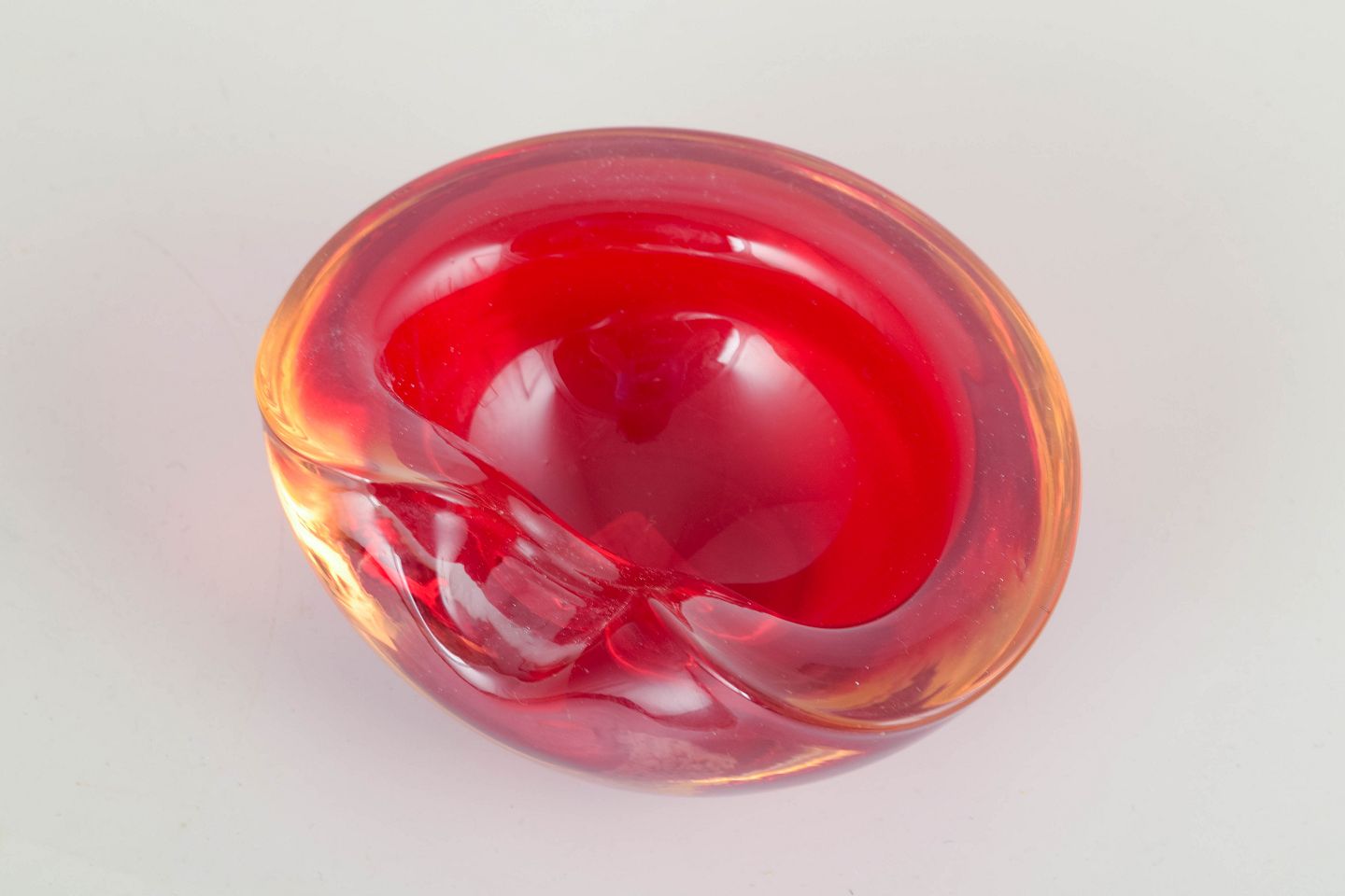 Organisk fritformet mundblæst skål i intens rubinrød sommerso-glas med blødt indfoldet rand og svævende klarhedsdybde — et klassisk eksempel på studioglas fra Murano.