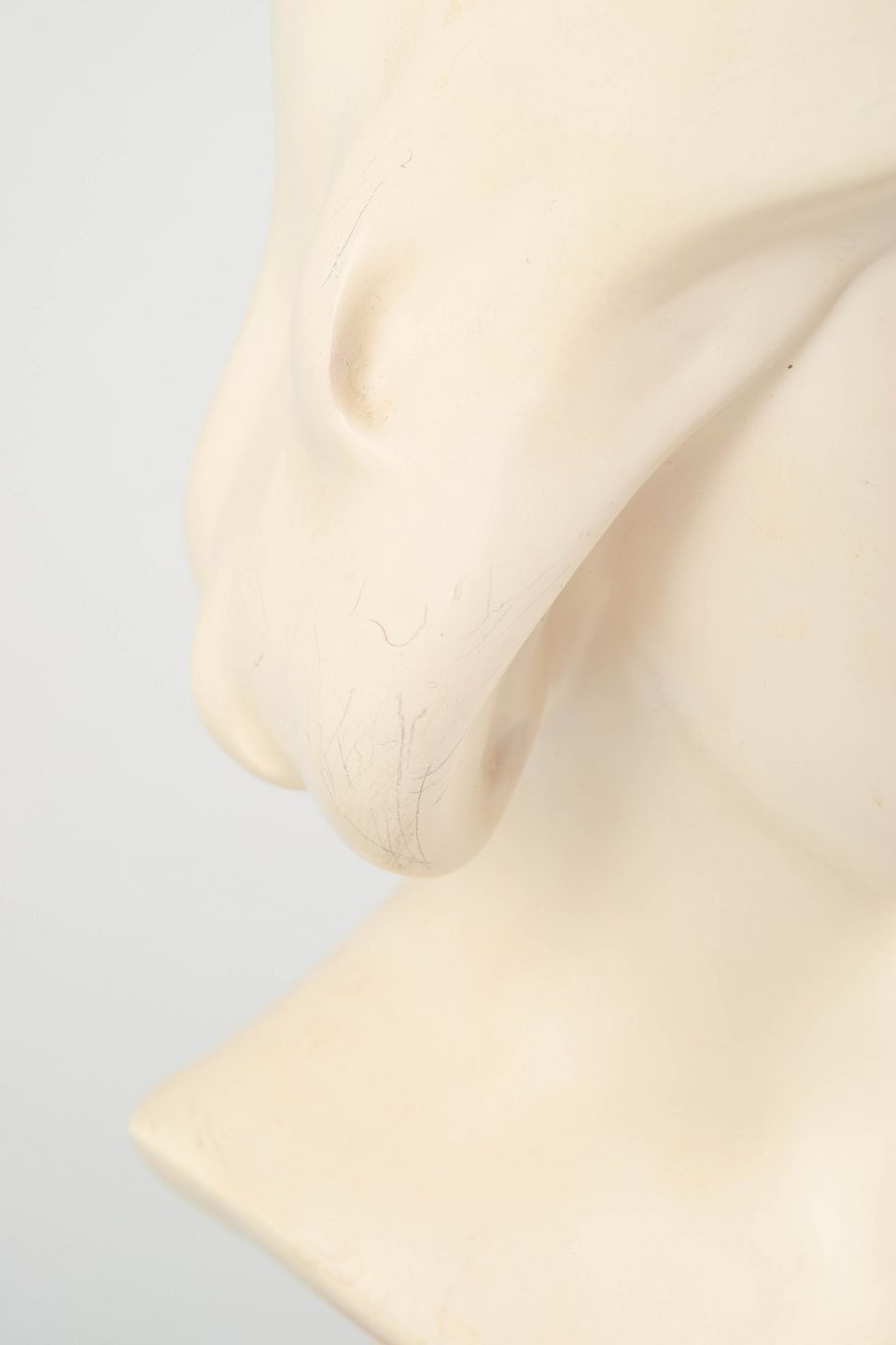 White-patinated plaster bust of a young girl on solid wooden base with original metal plaque “PÅSKLILJAN”. Classic naturalistic expression with a soft, matte surface.