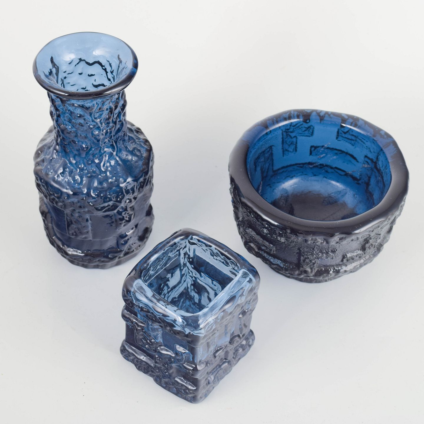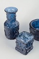 Mundblæste, skulpturelle glasvaser i dyb kobaltblå farve med markant isstruktur/relief — én høj cylindrisk vase, én firkantet og én skålformet. Et karakteristisk brutalistisk udtryk fra Ruda Glasbruk i 1970’erne.
