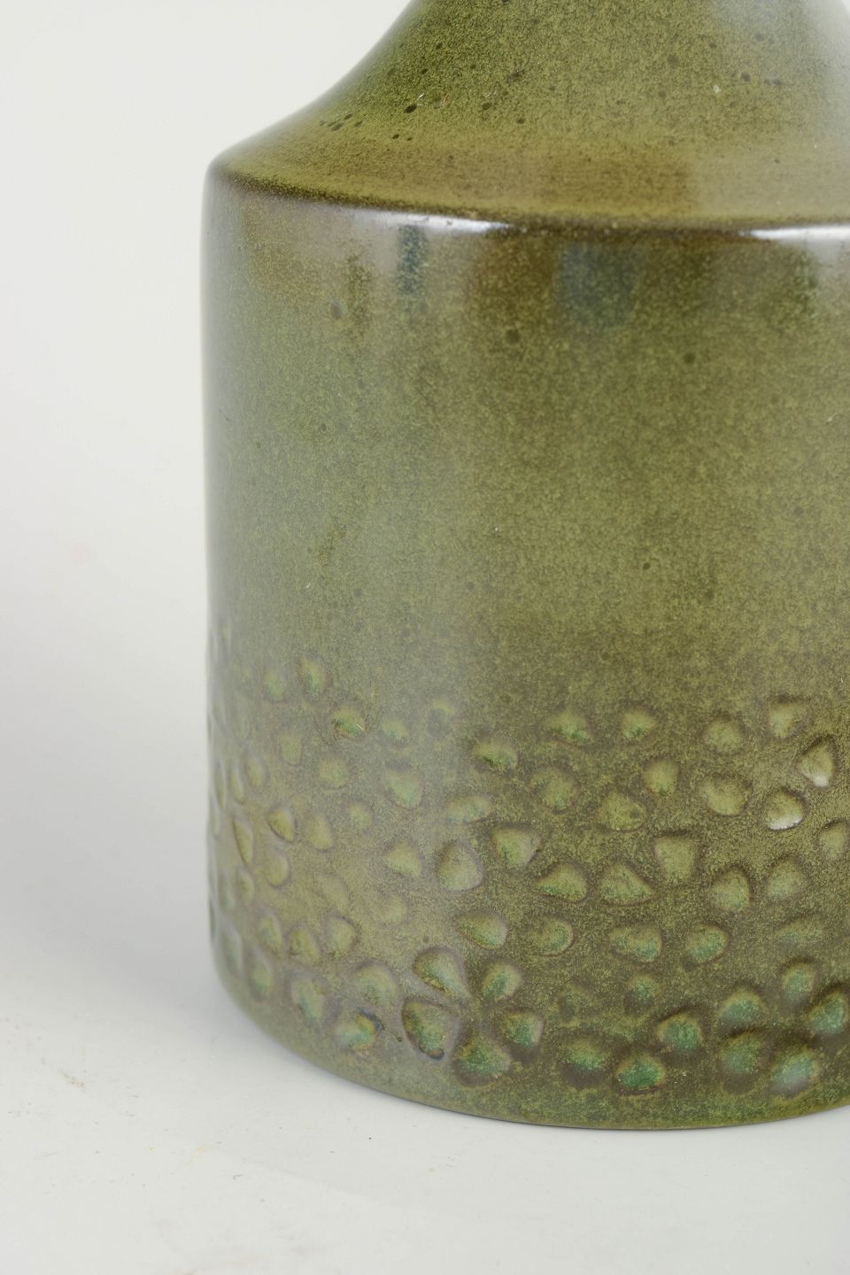 Cylindrical stoneware vase with two-part glaze — the upper half featuring a brown geometric relief grid, and the lower half a light yellow, tactile lava glaze. A classic example of Atterberg’s signature tactile surfaces and Nordic colour sensibility.