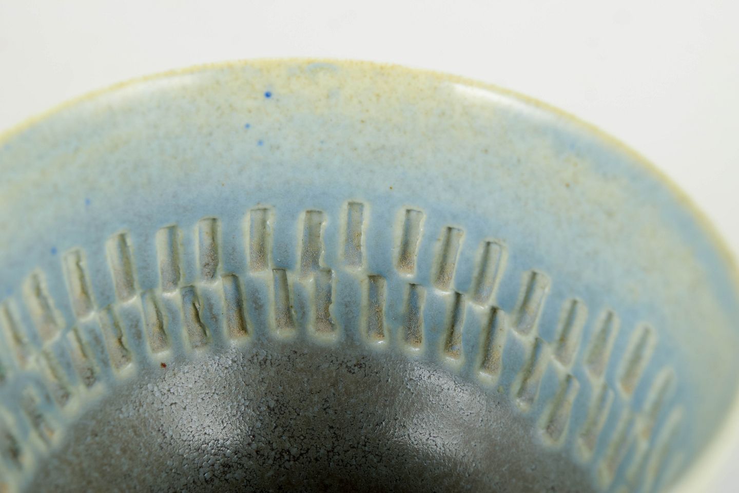 Unik hånddrejet studiokeramikskål i stentøj med eksperimentel testglasur i lyse blå-grønne nuancer med subtil indre farvegraduering og dekorative lodrette glasurstriber. Usigneret.