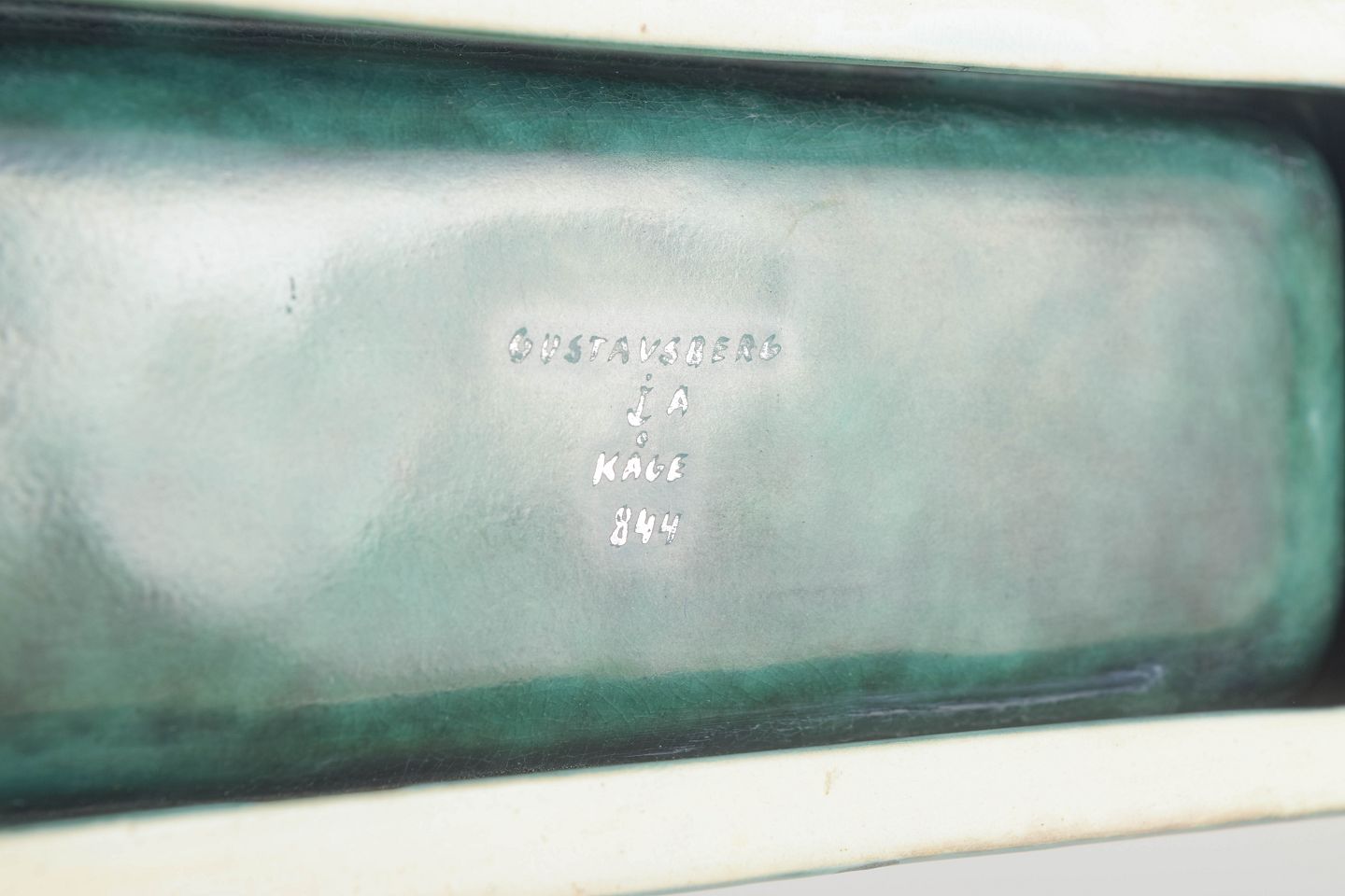 Wilhelm Kåge (1889–1960) served as head designer at Gustavsberg from 1917 and became a key figure in Swedish ceramic modernism. His Argenta series from the 1930s, combining cool turquoise glaze with refined silver inlay, is considered an iconic example of Scandinavian Art Deco design.