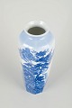 Elegant, håndmalet porcelænsvase i lyseblå glasur med dekoration af blå træer i klassisk kinesisk stil. Fin, slank form med smal hals og blød overgang til korpus.