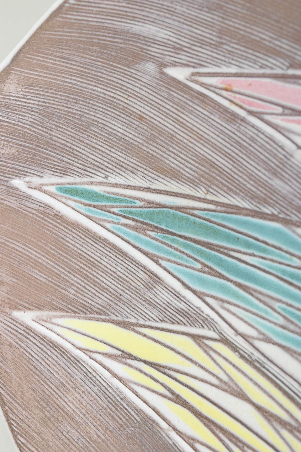Dekorativ rund skål med let organisk form og indgraveret overflade, håndmalet i geometriske felter i pasteltoner af gul, rosa og turkis på brun baggrund. En klassisk dekoration fra Mari Simmulsons 1950/60’er-produktion, hvor farver og form smelter sammen i et elegant modernistisk udtryk.