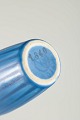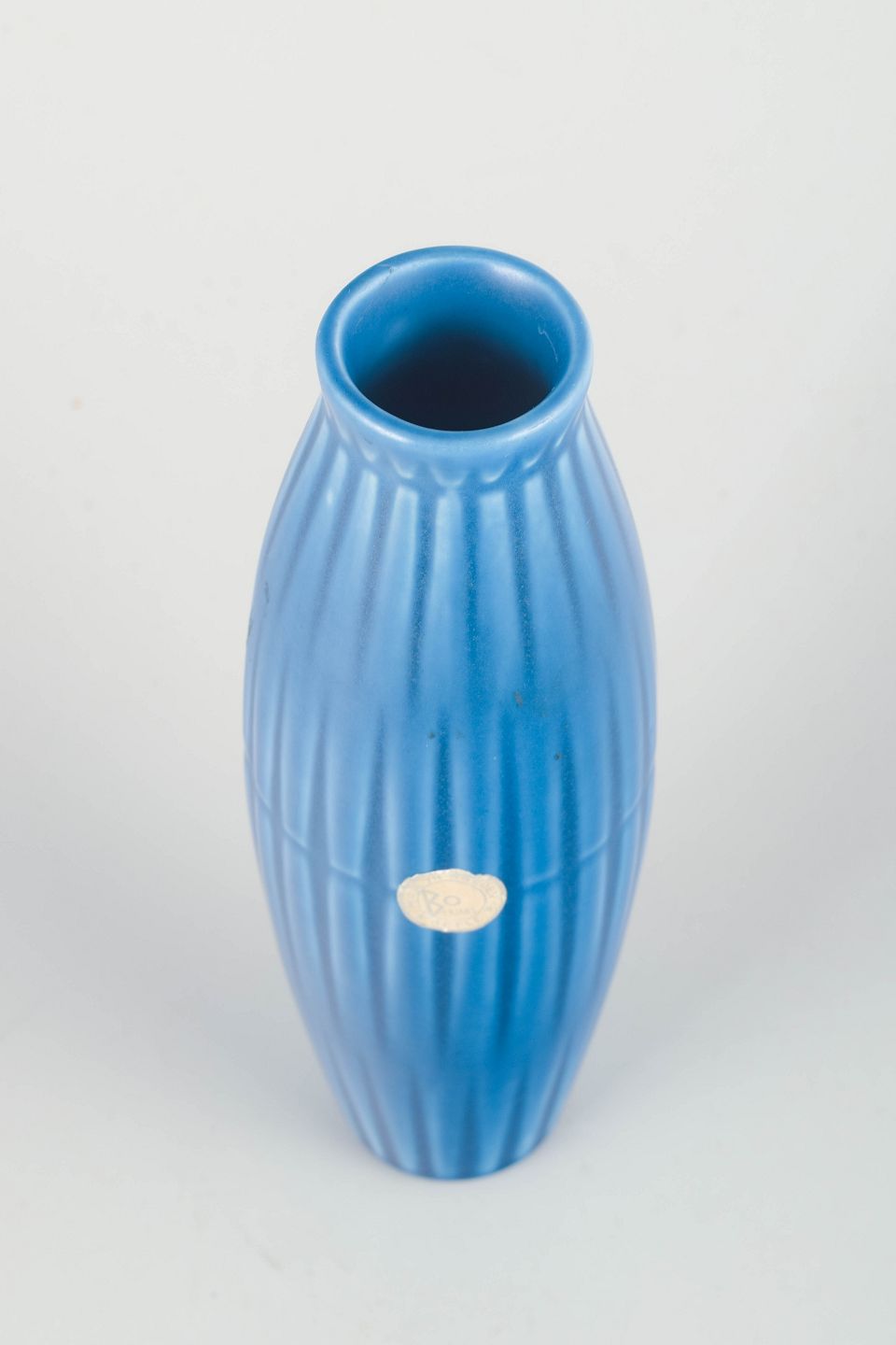 Elegant, riflet vase i blå glasur med mat overflade og stram, funktionalistisk form. Originalt mærkat “Bo Fajans Gefle, Made in Sweden” bevaret på forsiden.
