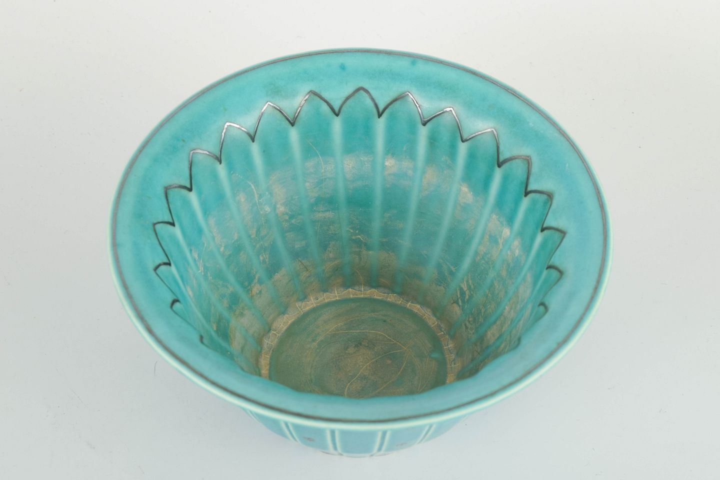 Stoneware with turquoise glaze and inlaid silver details. Decorated with vertical fluted panels and small silver-inlaid flowers along the sides and a scalloped rim. A fine early Argenta piece showing clear Art Deco influence. Light lime residue in the interior.